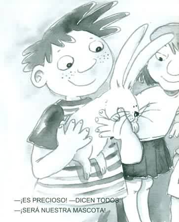 Quico va a la escuela con una jaula. En la jaula hay un conejo. Un conejo blanco de largas orejas.
