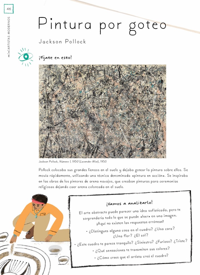 Una oportunidad muy especial de desarrollar tus capacidades artísticas a través de la observación y de inspiradoras actividades. A partir de veinte proyectos, espejo de otras tantas célebres obras (desde las primeras expresiones creativas de nuestros más remotos antepasados, en las cuevas, hasta el cautivador teatro de sombras con el que la artista estadounidense Kara Walker reivindica derechos fundamentales); y siguiendo la premisa de sugerir exclusivamente materiales fáciles de adquirir, Joséphine Seblon se mantiene fiel a la línea de trabajo en la que, con anterioridad, ya publicó obras similares sobre diseño y arquitectura. Una invitación a experimentar en la mejor compañía posible y, al mismo tiempo, curiosear en la vida y obra de grandes pintores y escultores de todos los tiempos. Para cada idea es preciso preparar, de modo previo, una pequeña caja de manualidades (sobre la que dan pistas); y una vez conocidos los ejemplos, ¡a disfrutar con total libertad creativa! No solo ciñéndose al dibujo, también recortando, modelando, imprimiendo e incluso, para los más valientes, realizando una instalación. Las técnicas no precisan de conocimiento previo ni exigen mucho tiempo de trabajo, aunque la autora recuerda en todo momento la necesidad de ser "ordenados" y ser conscientes de que hay que recoger tras cada experimento (algo que, sin duda, agradecen los padres y madres). Como base se proponen, aparte de los dos ya citados, las pinturas de caballos de la gruta de Pech Merle (15.000 años a. C.); las tablillas cuneiformes sumerias, pequeños vestigios de la civilización egipcia o de la pintura paisajística china, una máscara azteca o vidrieras medievales, en lo que se refiere al arte antiguo; y tejidos abstractos, de Anni Albers, esculturas en jabón de Barbara Hepworth, creaciones de Jackson Pollock, litografías de Wifredo Lam, óleos de Henri Matisse; texturas monocromas de Louise Nevelson, instalaciones inmersivas como las de Hélio Oiticica, arte urbano made in Basquiat, o imaginativos prototipos basados en el reciclaje, como los que firma Tony Cragg, entre otros muchos, en lo que se refiere al arte contemporáneo. Las ilustraciones, protagonizadas por niños y niñas que se ponen "manos a la obra" inspirados por esas ideas, son obra de Robert Sae-Heng, y sirven como complemento a la colección de fotografías mediante las que se referencian adecuadamente los modelos propuestos.