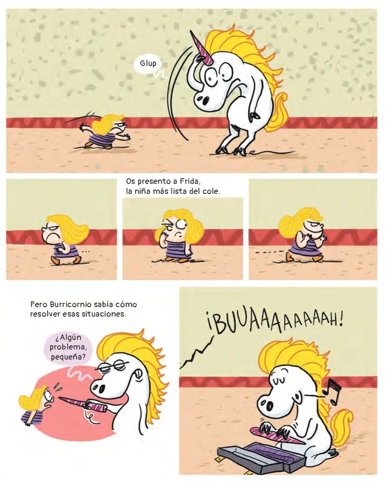 Cada mañana, cuando amanece en la granja Bellavista, los animales están encantados de sus rutinas, excepto Bruno, un burro que sueña, a imitación de su ídolo, el pollino de Shrek; con dejar un día el gris anonimato del campo y convertirse en una estrella. El paso del convoy del Teatro de las Maravillas le trae una oportunidad que podría aprovechar, pero, ¿qué puede hacer para impresionar al público? ¿Posee alguna cualidad excepcional? Lo tiene claro: ¡se hará pasar por un unicornio! Esta acción conlleva sus riesgos, no es fácil transformarse en alguien que uno está lejos de ser y máxime cuando una inteligente joven puede deshacer la mentira cuando empieza a alcanzar fama en su improvisada carrera. El autor despliega todas sus artes gráficas, destacadas en Canal Lector desde sus primeras publicaciones (allá por 2017); por su alegre personalidad y un caricaturesco, a la par que entrañable, elenco de personajes principales (animales humanizados como Camelia, la amiga cerdita del protagonista; Gracia, la vaca, o Manuela, la gallina; así como la despistada Julieta, granjera titular, o la inteligentísima Frida, una de las alumnas más aventajadas del colegio que visita el teatro). La puesta en escena, en la que encontramos analogías con series extraordinarias de animación como "La oveja Shaun" (Aardman Animations y HIT Entertainment); cautivará a los lectores que están empezando a dar sus primeros pasos autónomos en el hábito lector y en el disfrute de cómics.