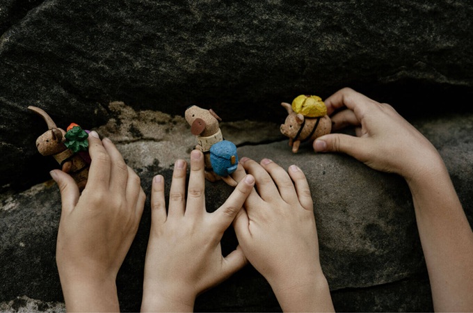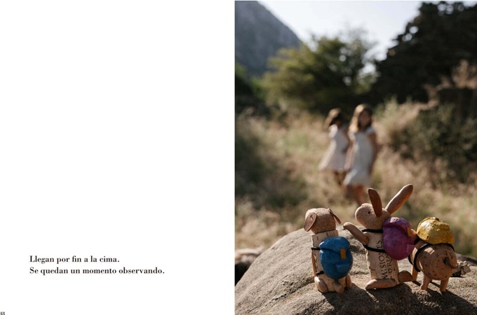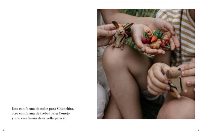 Los niños juegan y disfrutan de la naturaleza a la vez que ejercen de narradores, casi titiriteros, a partir de una serie de objetos artesanos que cobran vida entre las páginas al ritmo de las fotografías, instantes mágicos y poéticos de infancia que hilan las aventuras de Perro, Chanchita y Conejo. Las creaciones, esculturas de corcho, interactúan con los pequeños y con las flores -eterno lugar de encuentro-; al mismo tiempo que descubrimos los "tesoros" que, (¿quién no portó estas "piedras preciosas"?); se esconden en las mochilas aventureras: panes, guindas, zanahorias, piedras... Una alegoría del juego infantil, elemento mágico que conforma personalidades y afianza amistades, al que el contacto directo y libre con el paisaje otorga un epílogo feliz y complicidades deliciosamente retratadas por los autores. Extraordinaria y original propuesta que ha contado con la maestría de Isidro Ferrer en el diseño gráfico.