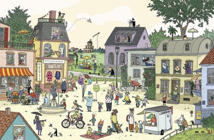 Un instante de la vida en el pueblo, fragmentos de una lúdica jornada campestre -con el circo instalado en las proximidades, en segundo plano, y preparado para cautivar a los más pequeños que quieran acercarse-; pasajes en la falda de la montaña, escenas de relajación en torno al lago, un paseo por el bosque, justo en el momento que ha empezado a llover, o un peculiar partido de fútbol (todos los protagonistas son animales humanizados); componen el catálogo de situaciones que el ilustrador alemán Seguir leyendo