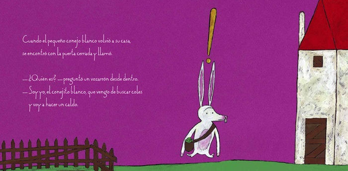 Cuando el pequeño conejo blanco volvió a su casa, se encontró con la puerta cerrada y llamó.