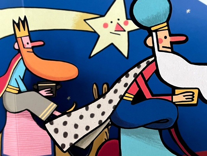 Al ritmo de las rimas consonantes, mientras brotan los troqueles -efectiva y brillante ingeniería en papel-; en cada doble página, acompañamos a los Reyes de Oriente en su camino tras el cometa reluciente. Tal y como relata la vieja historia, que ha acunado a tantas generaciones, oro, incienso y mirra llevan en sus zurrones, obsequios para un Niño, de mirada dulce y un halo especial, nacido en un portal entre el buey y la mula (que aquí también toman partido en la narración). A esos mismos monarcas, los niños de todas las generaciones siguen escribiendo cartas, llenas de ilusión y buenas voluntades, a la espera de que algo llegue a cada hogar. Mientras tanto, bajo las luces del árbol, al calor de la familia, entre celebraciones y cabalgatas, el relato invita a conservar la ilusión en una lectura compartida, de tintes teatrales, que garantiza la atención por el cálido y colorista trabajo de Inaraja, fiel a sus premisas gráficas habituales, y al espectáculo tridimensional que genera el paso de las páginas, una experiencia analógica que estimula la imaginación y mantiene la esencia del relato bíblico en los primeros lances.