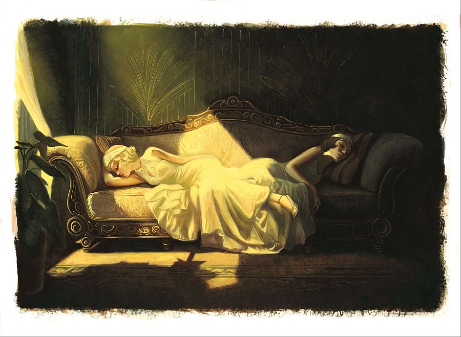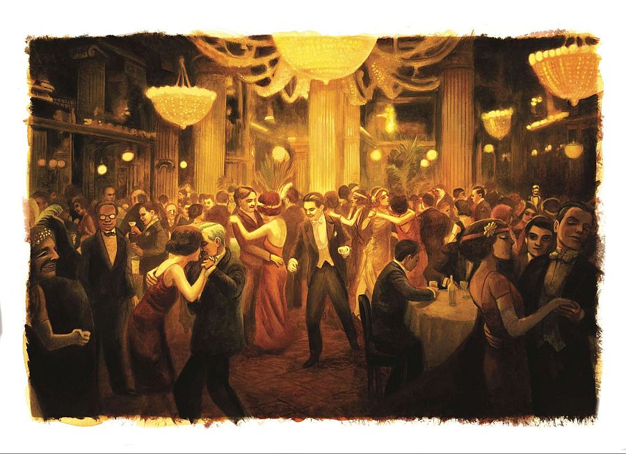 Benjamin Lacombe (París, 1982); no necesita presentación. En los últimos años ha confirmado que es uno de los ilustradores más talentosos e influyentes de su generación. Avalado por grandes éxitos, ha insuflado nueva vida a clásicos de la literatura universal al mismo tiempo que presentaba inolvidables relatos en el que se hacía cargo de texto e imagen. En esta versión del célebre título de Francis Scott Fitzgerald, adapta su estilo característico, teñido de melancolía, al ecosistema sofisticado y decadente que destila la novela publicada hace un siglo (1925). El resultado es una interpretación con empaque, oscura y nostálgica que, sin duda, cautivará a los lectores más exigentes. Con ritmo crepuscular conocemos las andanzas y pasiones del enigmático millonario Jay Gatsby, obsesionado con la bella Daisy Buchanan. Esa relación es el vehículo perfecto para describir la realidad social de los Estados Unidos en aquella "feliz" década, caracterizada por una prosperidad económica sin precedentes, la consolidación de un género musical fascinante -hay ecos del mejor jazz entre las imágenes-; pero también momento de especial florecimiento de actividades delictivas como el contrabando. Fitzgerald pone sobre la mesa la fragilidad del "sueño americano", apunta con su foco certero a los excesos que abrieron la puerta a la decadencia, con el regalo añadido -cada pocas páginas- de una sensacional lámina (simple o doble) para detenernos y disfrutar. Cada episodio incluye elementos decorativos y un hilo separador que convierten el formato en exquisito placer para los sentidos. El propio artista firma un interesante posfacio en el que desgrana su motivación para aceptar este reto, al mismo tiempo que comparte una amplia bibliografía consultada o breves apuntes biográficos del escritor norteamericano al que se homenajea. En lo que se refiere a la técnica, combina dibujo tradicional con técnicas digitales, generando contrastes de luz y color o escenas casi teatrales "marca de la casa".