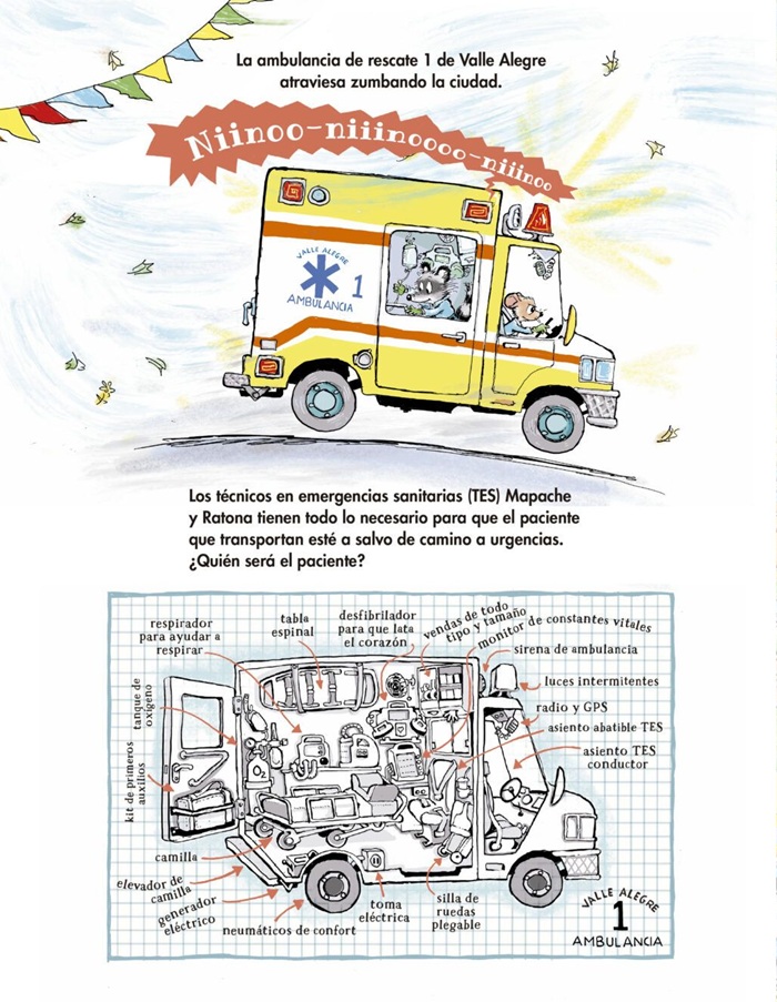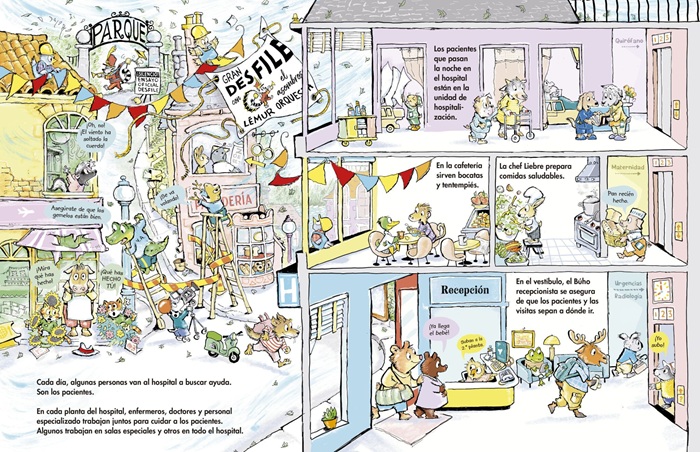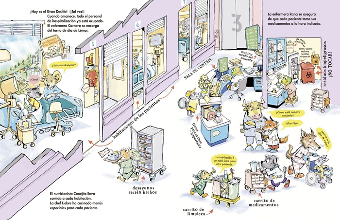 Los servicios públicos disponibles para los ciudadanos de Valle Alegre gozan de excelente vitalidad y cuentan, por lo que vemos, con plantillas carismáticas y comprometidas de profesionales. Hace poco conocíamos los entresijos de su Parque de Bomberos, hoy nos abren las puertas del hospital, un espacio que desarrolla el crucial trabajo de cuidar la salud de todos los componentes del clan, variopintos animales humanizados. Además, en estos días se celebra el Gran Desfile en el centro de la urbe, lo que está generando inquietud e incluso hechos insólitos, como que algunos personajes guarden sitios en los toldos de los comercios para asegurar una buena visión desde días antes. Aunque los contenidos referentes a las especializades del centro médico o las escenas en las habitaciones y quirófanos puedan parecer fruto exclusivo de la imaginación de la autora, lo cierto es que ha contado con una revisión profesional por parte de la técnica en imagen para el diagnóstico del Hospital Universitario de Girona, Kirste Jane Mowatt. Además de mostrar la dinámica de trabajo, presentan el ramillete de profesiones adscritas a cada planta, metodologías de atención al enfermo y otras situaciones, complementarias, desde una óptica humorística a la par que informativa. Al mismo tiempo, Alley introduce un juego de agudeza visual consistente en localizar a una serie de personajes en las láminas ilustradas. La secuenciación bebe del lenguaje del cómic (bocadillos, alternancia de viñetas enmarcadas y sin recuadrar...); y de los libros interactivos de búsqueda, tan populares en los años ochenta y noventa del siglo XX. La construcción de las panorámicas a doble página -desde las guardas-; integra tantas acciones e interacciones entre los protagonistas que están garantizadas horas de buen humor escudriñando cada detalle. Además, la presentación de las labores de los especialistas puede despertar la vocación temprana de los pequeños lectores y ofrecer respuestas a la típica (y tópica) pregunta con la que se les aborda frecuentemente: "Y tú, ¿qué quieres ser de mayor". Sugerente y divertido.