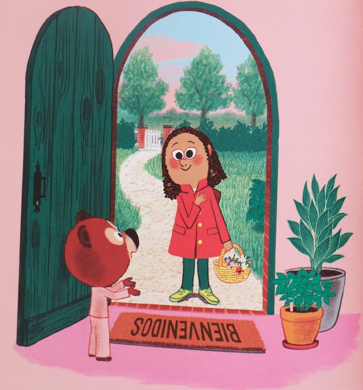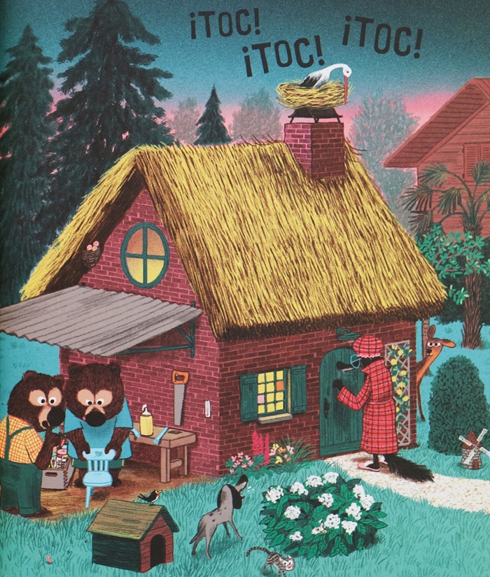 Osito disfruta en la habitación de su última adquisición literaria, seguro que se trata de un relato adictivo y de calidad (como intuimos viendo la pila de lecturas pasadas, entre las que se encuentran "Ariol", un autohomenaje del ilustrador, el genial Marc Boutavant -a lo largo del relato también nos parece identificar a un primo cercano de "Perro apestoso"-). Pero mantener la tranquilidad en un momento tan placentero se antoja difícil cuando, cada pocos minutos, la puerta de la casa no deja de ser aporreada por distintos y conocidos personajes que buscan refugio y, sobre todo, un plato de la afamada papilla del anfitrión. Por allí desfilan Ricitos de Oro, Caperucita Roja, los Tres Cerditos (los únicos que mantienen su apariencia original); también la abuelita... ¡Un momento! ¿Seguro que es la abuelita? ¿No tiene los brazos demasiado peludos? Solo la picaresca del protagonista permitirá un final feliz y, por supuesto, alcanzar definitivamente el placer perseguido: meterse bajo las mantas y continuar saboreando su libro... Al hilo del divertido retelling de la poeta británica, Boutavant despliega su catálogo de divertidas ilustraciones, resultado de la fusión de protagonistas perfilados en trazos sencillos y expresivos, con una paleta cálida de ocres, verdes, naranjas y rosados, bañada por luz natural, que aporta una sensación de acogedora intimidad. Cada doble página, desde las guardas -al amanecer, al atardecer-; esconde una amplia variedad de detalles que se aprecian mejor en una sesión compartida, desde cambios en la iluminación que marcan el paso del tiempo hasta escenas en segundo plano que enriquecen la atmósfera doméstica, a cada minuto más caótica y atestada de gente...