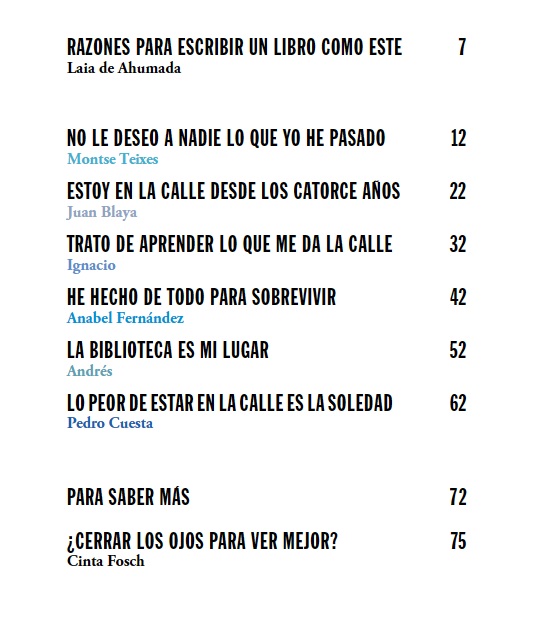 Tanto la autora como la editorial Akiara siempre han mostrado un hondo y admirable compromiso social en sus publicaciones. Con anterioridad, Laia de Ahumada plasmó en papel, por ejemplo, el testimonio de emigrantes forzosos, a los que conoció en el transcurso de su desempeño profesional. Ahora comparte otras tantas crónicas, firmadas por protagonistas de diversas edades, tomando como punto neurálgico la trayectoria del Centre Obert Heura, una asociación para personas sin hogar que Ahumada cofundó y en que ha coordinado durante cerca de veinte años. Un largo proceso que implicó el desprenderse de clichés, algo que seguro ocurrirá también con los lectores que se acerquen a esta poliédrica propuesta; y que retrata no solo la realidad de los indigentes, sino también de todas aquellas, cada vez más, personas que habitan viviendas indignas, situación igualmente denunciable. Las entrevistas muestran panorámicas variadas, algunos ya han abandonado la calle, otros viven en centros de acogida, otros sobreviven deambulando por las calles de la ciudad. Los actores principales comparten el impacto que ese modo de vida ha provocado en su salud y el deterioro físico consecuencia de experiencias extremas. La obra no solo da voz a sus inquietudes, también denuncia la necesidad de dar un paso más allá y superar las "pseudosoluciones que se ofrecen y que no dan respuesta a sus verdaderas necesidades". Gracias a la palabra de Montse, Juan, Ignacio, Anabel, Andrés y Pedro, los jóvenes pueden empatizar con experiencias que no forman parte de una serie de ficción, son extractos de realidad cotidiana del XXI, a tiempo de contribuir en el proceso de que la sociedad y las autoridades cambien su mirada, se produzcan mejoras en los servicios, en la prevención de distintas situaciones... La tinta azul es protagonista esencial en el trazo del relato gráfico, cuyo bocetaje básico aparece en el epílogo de la obra, distribuido en metafóricas escenas definidas mediante procedimientos digitales.
