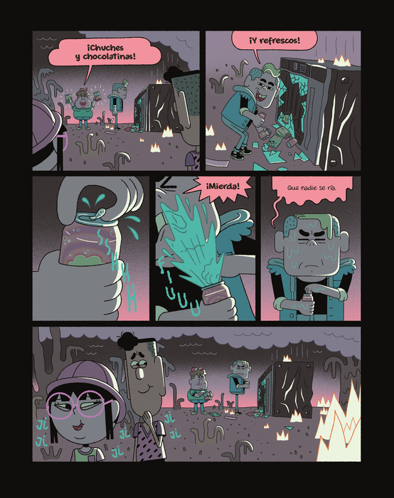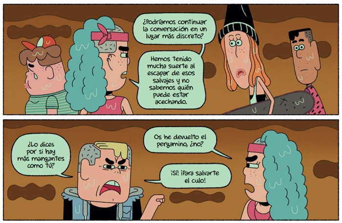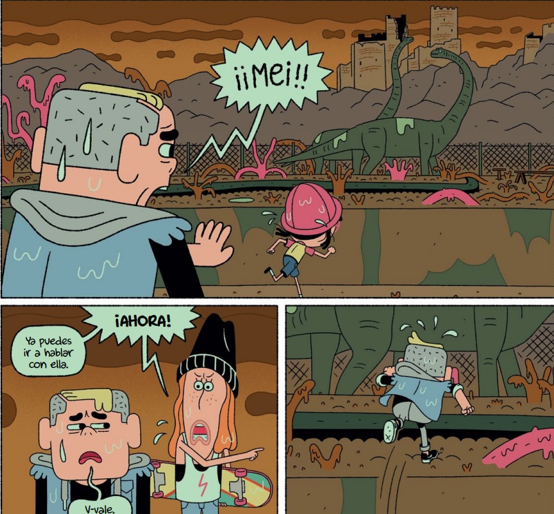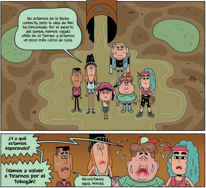 La trilogía de tintes distópicos llega a su fin con una nueva aventura de la pandilla, recién llegada de su viaje a través del tiempo a un futuro inquietante y poco esperanzador. Las consecuencias del cambio climático son demoledoras y para sobrevivir, algunos humanos han tomado la determinación de luchar contra la corporación energética que, con aviesas intenciones, actúa como dueña del mundo. La chispa que ha provocado el despertar es el corte de suministro (de agua e internet), que pone en peligro la existencia de, sobre todo, los más débiles. Inmersos en la rebelión contra el ejército de robots, los valores y vivencias acumuladas a lo largo de las anteriores andanzas serán muy útiles al grupo, que aquí suma una nueva integrante. Más allá de llegar o no a buen puerto lo importante también es conocer si Piero, Sara, Mei, Arnold, Driss y Arlette serán, además, capaces de volver a su presente real. Bajo los trazos caricaturescos, rasgos geometrizantes e interacciones con diálogos chispeantes, la historia hace referencia, de forma solapada, a otros problemas del mundo actual como el acoso escolar o la necesidad de concienciar sobre la importancia de proteger nuestro medio ambiente, consignas que tienen ya muy presentes -por fortuna-, las nuevas generaciones de lectores. Una serie muy interesante que transcurre por imaginativos y variopintos escenarios, como hemos visto en los capítulos anteriores, desde parajes yermos hasta territorios poblados de seres prehistóricos.