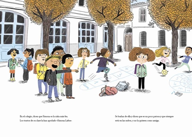 El tipo de "tontos de clase" que describen los autores, lamentablemente, siempre ha existido. La forma en la que tratan a la protagonista, a la que apodan despectivamente "Simona Lafea", contrasta con su mejor defensa: una sonrisa de oreja a oreja para hacer frente a las palabras necias, porque bien sabe que "hay otras mil maneras de describirla" más cercanas a la realidad. Posee tantas cualidades, ilusiones y sueños que, con un poco de imaginación, puede evadirse de esos momentos grises saboreando cualquier... Seguir leyendo