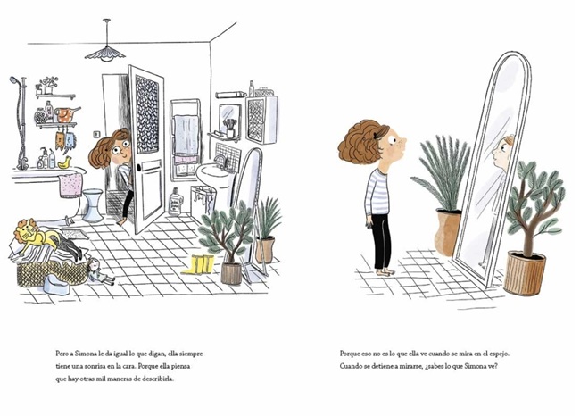 El tipo de "tontos de clase" que describen los autores, lamentablemente, siempre ha existido. La forma en la que tratan a la protagonista, a la que apodan despectivamente "Simona Lafea", contrasta con su mejor defensa: una sonrisa de oreja a oreja para hacer frente a las palabras necias, porque bien sabe que "hay otras mil maneras de describirla" más cercanas a la realidad. Posee tantas cualidades, ilusiones y sueños que, con un poco de imaginación, puede evadirse de esos momentos grises saboreando cualquier de sus múltiples personalidades. Puede ser inventora, astronauta, domadora de fieras... incluso cazafantasmas o algo que, a veces, acarrea más responsabilidades, como hermana mayor. Lejos de vengarse, cuando sus talentos alcancen notoriedad, seguirá con la misma sonrisa, ignorando las situaciones que siguen repitiéndose en los centros escolares y demostrando que la única y verdadera riqueza en este mundo es "ser diferente". El creador de series como "Adele" o el "Monstruo del armario", también conocido como Mr. Tan; se alía con la siempre genial Magali Le Huche, creadora de un estilo bien reconocible en el territorio del cómic y de la LIJ actual, para brindarnos este inspirador relato, ideal para afianzar la autoconfianza y hacer frente, con firmeza, a los inevitables abusones que siempre brotan en todo tiempo y lugar.