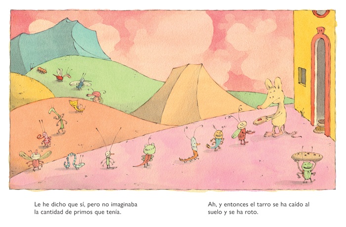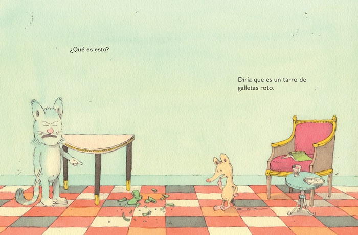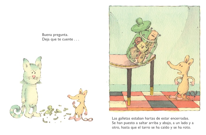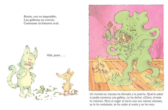 Gato y Ratón tienen, como todos, algunos pequeños problemas de convivencia. Ruzzier, que tiene un don para captar el ecosistema cotidiano de animales humanizados unidos por sólidas amistades (recordemos a Fox y Chick, o a los ratones y patos que han protagonizado otros relatos anteriores); describe la situación que se produce a partir del hallazgo, por parte del primero, de un gran bote de galletas que se ha caído al suelo. Todo apunta a que Ratón es el culpable, pero este justifica su inocencia con una imaginativa coartada en donde cobran protagonismo desde los propios dulces -que parecen tener vida propia-; hasta diferentes personajes fantásticos, como extraterrestres o monstruos, convertidos en responsables del desaguisado. La magia de la narración oral cautiva al felino, al que finalmente le da igual el responsable del accidente mientras siga disfrutando de cuentos tan divertidos. La amistad de los compañeros está a salvo, y la imaginación del pequeño transforma lo cotidiano y carente de importancia en momentos de pura fantasía, siempre con un toque de humor enriquecedor, como acostumbra a hacer en sus cómics y libros ilustrados el afamado autor e ilustrador milanés.