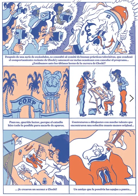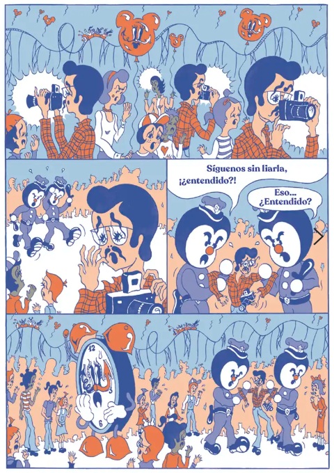 El universo onírico, saturado de personajes, objetos y acciones, en una reducida paleta de tonalidades, que emplea el joven diseñador francés Mathias Martinez para describir las surrealistas y macabras aventuras de Clocki, constituyen una de las señas de identidad de este creador, aficionado a generar una climas dicotómicos en los que reina, a partes iguales, lo angustioso con lo seductor. La identidad visual es reforzada en una edición muy elegante, en la que se han cuidado todos los detalles, desde la tipografía hasta la distribución de los cartuchos narrativos o la inclusión de una camisa desplegable que se transforma en un divertido póster. Destacada con una Mención Especial en la categoría "Comics Young Adult" de los premios que se otorgan en la Bologna Children's Book Fair, narra la rocambolesca historia de un antiguo héroe de cómic, emparentado visualmente con las creaciones de autores como Grim Natwick, Shamus Culhane y otros iconos del cartoon. Una falsa biografía que permite acercarse al ocaso y degeneración del que fue, un día, primer protagonista animado con sonido y color en la historia del cine. Aquel eco mediático fructificó en la inauguración de Clockiland, un parque de atracciones que sigue fascinando a las nuevas generaciones. Sin embargo, como otras aparentemente felices creaciones, en el origen del personaje y de su particular universo lúdico confluyen extrañas e inquietantes revelaciones. El puzle se construye a partir de las declaraciones y vivencias de diversos personajes que trabajaron o visitaron este centro de ocio. Magistral acercamiento a la estética visual que triunfó en los dibujos animados y cómics de la tercera década del siglo XX, con una distorsión de protagonistas y escenarios que confiere un halo grotesco y angustioso al relato (retratado con crudeza, por ejemplo, en el horror que sufre, al ritmo de rock and roll, la pequeña Susi). Trufado de crítica social solapada y sentimiento de amenaza constante, como bien señalan en la promoción editorial, las viñetas parecen acercarnos a un final desolador, "como si estuviera a punto de quemarse la película en el proyector". Original e irreverente.
