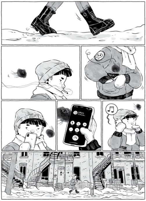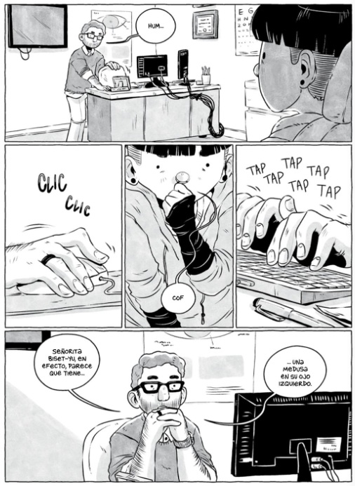 Samantha Leriche-Gionet, que firma sus cómics con el seudónimo BOUM, conmueve con una galardonada historia (tanto en su país, Canadá, como en la industria norteamericana, donde obtuvo un Eisner); de tintes autobiográficos. Odette acude al optometrista y recibe un extraño diagnóstico que, sin embargo, en cierto modo, esperaba. Tiene una medusa en el ojo. La vida continua sin variaciones tanto en la librería en la que trabaja como en la relación que mantiene, hasta la aparición, casi simultánea, de una chica por la que siente atracción y del progresivo agravamiento de su dolencia, simbolizada en una multiplicación de esas alteraciones visuales. Mientras trata de asumir un mal degenerativo, afronta los radicales cambios en su ecosistema personal con los miedos inherentes a la soledad. Un emocionante relato teñido de amistad, amor y tenacidad, secuenciado con elegancia a lo largo de las cuatro estaciones, a través de diseños narrativos originales que transmiten a los lectores las mismas sensaciones de inestabilidad y angustia que siente la protagonista. A lo largo de la novela gráfica, trazada en blanco y negro e influenciada por rasgos del manga, encontramos abundantes referencias a distintos iconos de la cultura popular (la música de Violent Femmes, Prince, Gorillaz, Janelle Monáe o Le Tigre; los cómics de Rumiko Takahashi, o los animes de Yukito Kishiro).