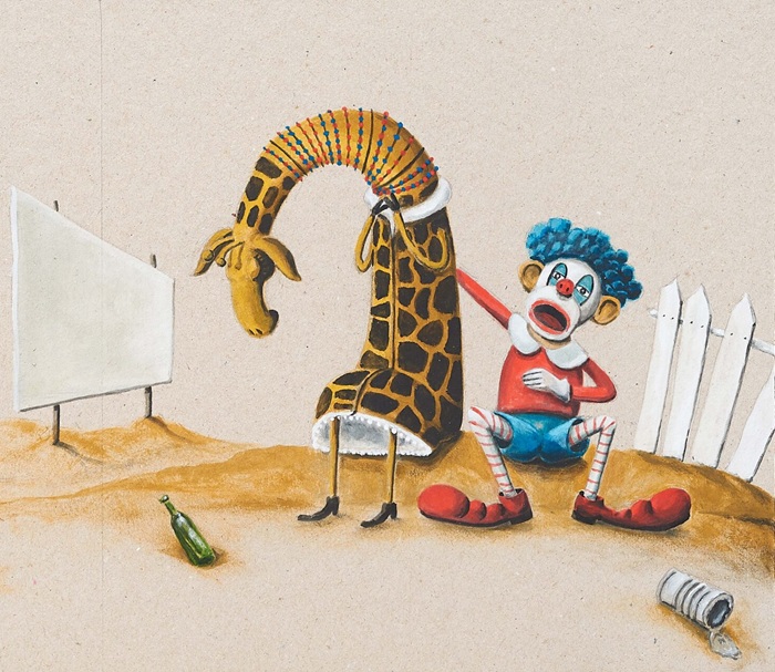 La invasión turística de los castores contribuye a terminar con la calidad de vida en la sabana. Jirafa debe emigrar, cruzar el mar con la esperanza de encontrar nuevas oportunidades. Pero allí lo único que descubre es una sociedad hostil y antipática, a excepción de un payaso y un grupo de animales que, empáticos y solidarios, deciden apoyar a la protagonista con una masiva manifestación que reivindica un trabajo a medida. Tras ejercer varias profesiones, su ejemplo trasciende fronteras y llega, de boca en boca, a las nuevas generaciones que aún perviven en el continente africano. La historia, editada con una camisa que invita a los pequeños lectores a construir el personaje principal y pasar un rato divertido tras la lectura, simboliza las dificultades que encuentran todos aquellos que se ven obligados a abandonar su lugar de origen, con una solapada crítica social que clarifica prejuicios y actitudes endémicas en las sociedades. El apartado gráfico combina técnicas tradicionales y digitales para conferir un ecosistema peculiar que fusiona humor con momentos de tensión emocional, siempre con un nutrido grupo de animales humanizados al frente.