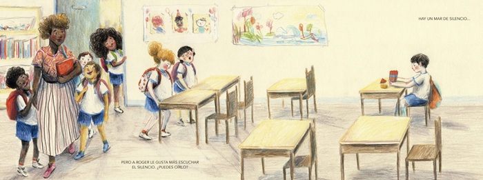 Frente a la algarabía, Roger se refugia en el silencio. Su devenir, en el día a día, recuerda al de una ballena que, en los momentos de tensión, opta por sumergirse. Cuando llega su cumpleaños, la concentración de emociones, sonidos y personas que muestran su afecto provocan, como algunos días en el colegio, una evasión submarina en la que irrumpe, como un dulce asidero al que agarrarse, su familia y una amiga que abre la puerta a un recurso esencial. En ese pentagrama, el protagonista -y sus padres-; caminan de forma más confortable en cada jornada, a la espera de cruzarse con un cetáceo real, ese que se adivina en su mirada. Una bella metáfora ilustrada con trazos de crayón, en formato álbum, que invita a los lectores a empatizar con los sentimientos de las personas neurodivergentes, a través de una aproximación poética a su rico y silencioso mundo interior. La propuesta gráfica, secuenciada en grandes escenas dispuestas a sangre y planos cortos del personaje principal, arrastran al lector a una corriente de emociones clarificadoras que, seguro, contribuyen a avivar la empatía. Entre sus reconocimientos internacionales figuran el BRAW Amazing Bookshelf en la Feria de Bolonia de 2025 y su inclusión en la lista de obras "altamente" recomendadas de la FNLIJ de Brasil.