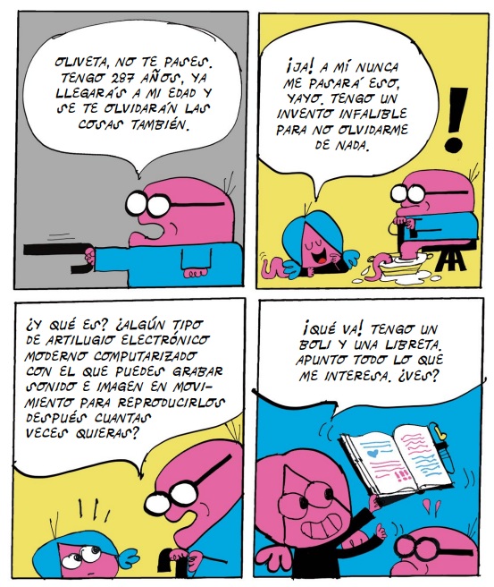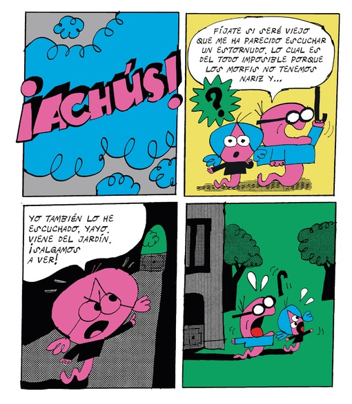 El espíritu divertido y transgresor del fanzine, ámbito en el que Lorenzo Montatore, tiempo atrás, dejó su sello, está presente en la primera aventura de Los Morfis. Un cómic divertido e irreverente, concebido para el público infantil, que utiliza el fotomontaje, el humor escatológico y una estética pop y luminosa -que recuerda a la ideada por Talus Taylor y Annette Tison, o a otros iconos de los sesenta y setenta del siglo XX como Pierre Culliford-; para dibujar una sonrisa en los lectores a base de nombres ocurrentes y sencillos gags. La aventura nos traslada al planeta nacido a partir de la colisión de la gran pelotilla (no preguntéis detalles sobre la pangea de la que parte su ecosistema), con la estrella de Boskov. Allí residen Oliveta y su "yayo", quienes descubren un huevo extraterrestre al que acompaña...un pato. Tras debatir sobre su origen y posible nomenclatura en compañía de los componentes del cabildo (momento que describe a la perfección el modus operandi de algunos políticos), llegan a la conclusión de que incluso podría ser una estratagema del malvado Pelusso, una culebra cascabelera con muy malas ideas. Mientras custodian el insólito asteroide, el calor provoca su rotura y la posibilidad de conocer a su huésped, personaje desagradable que, sin embargo, facilitará la construcción de un sistema defensivo (el muro de "Bertín") que puede garantizar, por mucho tiempo, la seguridad del pueblo sin nariz frente al mal. En la parte final se ofrecen fragmentos de la libreta de ideas del autor, en cuyas páginas creció la semilla del cómic, además de algunas composiciones extra que beben de la estética "Bruguera" -la plancha parece sacada de la revista DDT-; o un cartel anunciador de la gran fiesta que se celebra en las últimas páginas.