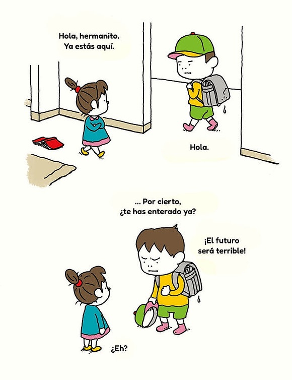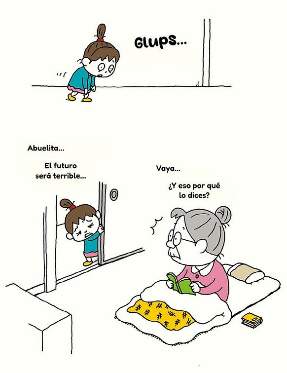 Los mayores dicen que, en el futuro, pasarán cosas horribles. Un amigo del cole lo ha escuchado allí, también lo certifica el hermano de la protagonista... Pero la, seguramente, más sabia de la familia augura lo contrario. No tiene por qué ser tan terrible, seguro que hay muchas cosas interesantes y divertidas. Y es que, en ocasiones, la gente cree saber muchos datos que, en realidad, desconoce. Apoyada en la teoría de la abuela, nuestra protagonista deja rienda suelta a la imaginación y diseña mil horizontes posibles, todos ellos sugerentes y muy divertidos, incluso válidos para desactivar abusones y fabricar alternativas a comidas que no nos encantan. El mismo algoritmo puede aplicarse tanto a la hora de diseñar un mundo más justo como a la hora de cenar. Un simple huevo puede transformarse en una experiencia culinaria o lúdica inimaginable, aunque casi siempre la sugerencia de mamá suele ser la más fiable. La sensibilidad e inteligencia del artista japonés Shinsuke Yoshitake, que ya cautivó a la audiencia con sus anteriores títulos, está presente en un relato barnizado de sentimientos y pensamientos filosófico-poéticos que parten de lo cotidiano.