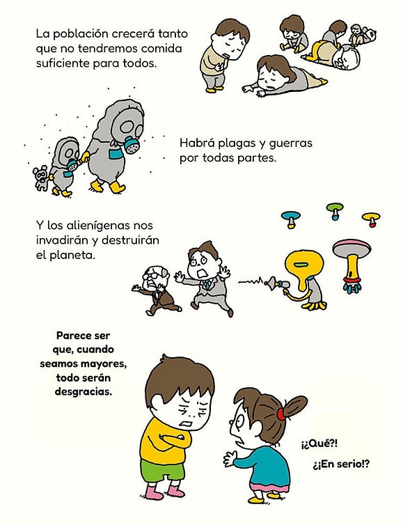 Los mayores dicen que, en el futuro, pasarán cosas horribles. Un amigo del cole lo ha escuchado allí, también lo certifica el hermano de la protagonista... Pero la, seguramente, más sabia de la familia augura lo contrario. No tiene por qué ser tan terrible, seguro que hay muchas cosas interesantes y divertidas. Y es que, en ocasiones, la gente cree saber muchos datos que, en realidad, desconoce. Apoyada en la teoría de la abuela, nuestra protagonista deja rienda suelta a la imaginación y diseña mil... Seguir leyendo