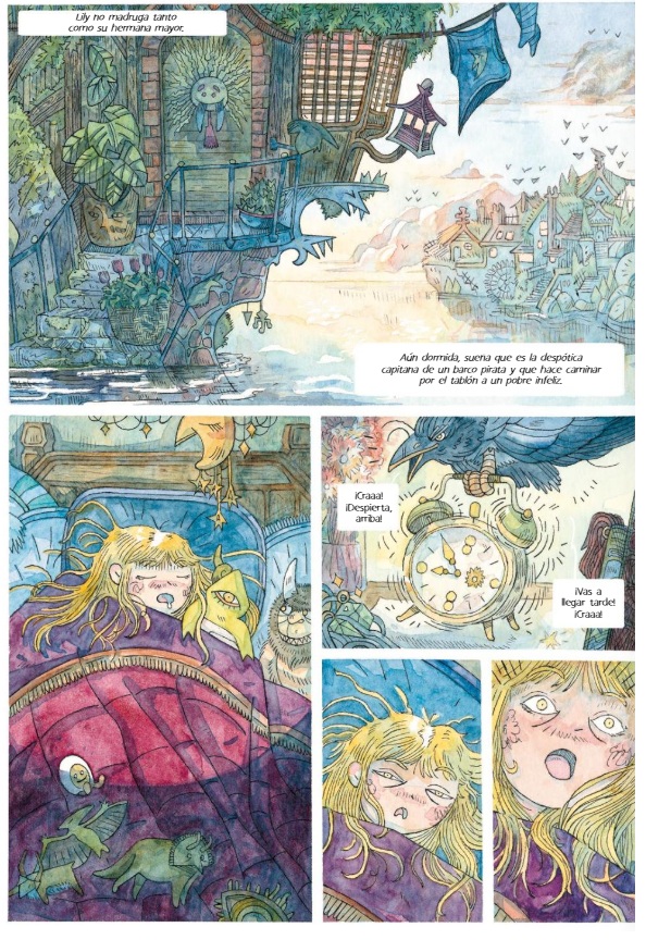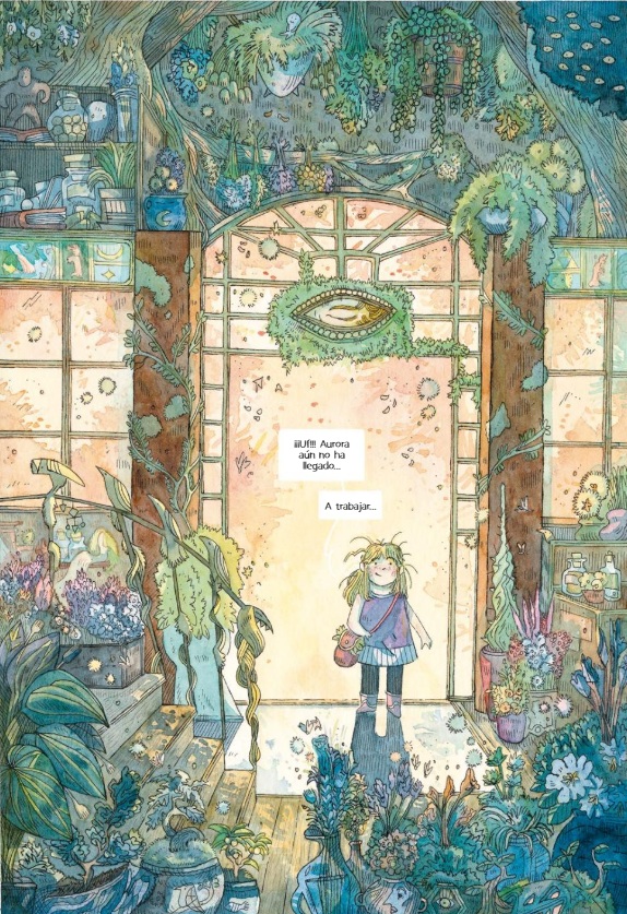 Desde las guardas, el artista francés Vincent Dock nos invita a adentrarnos en el sugerente mundo floral en el que transcurre la acción, con personajes y escenarios trazados a plumilla y colores al agua que confieren a cada página gran elegancia; y ecos, en algunos aspectos, de concepciones gráficas propias de Studio Ghibli y parentescos con la estética presente en las propuestas de otras autoras contemporáneas, como Nuria Tamarit o Gaëlle Geniller. La trama, de corte cozy, presenta las andanzas de dos huérfanas con capacidades mágicas (la hermana mayor, entre otras cosas, se desplaza en escoba voladora); que regentan la antigua floristería de sus padres. Aprovechando una jornada en la que solo Lily, la más pequeña, atiende al público, los hermanos Fimus y Fuligo, quienes se presentan como periodistas de la prestigiosa revista Cosmoficus Magazine, embaucan a la protagonista remarcando la reputación que tiene la tienda en todo el archipiélago. La otra bruja, Aurora, llega a tiempo para despedir a los desconocidos sin sospechar sus aviesas intenciones reales. Tras visitar al gran botánico, Sebastián, un huraño ser encerrado en una isla por voluntad propia, y comprender algunos secretos propios de su linaje, emprenden camino a las peligrosas islas de escarcha a la búsqueda de una planta ultrarrara. Al mismo tiempo, los oscuros navegantes que visitaron a las hermanas, trazan un plan de contraataque para prender fuego al negocio y hacerse con el árbol prístino que puede hacerles ganar una fortuna y garantizar la buena salud de su navío. Plantasía es el escenario, pues, de un enfrentamiento que traerá la desgracia a las jóvenes o afianzará la tienda como un proyecto con futuro, no solo una herencia de los que ya no están. Un derroche de originalidad con planteamientos estéticos muy seductores, editado con elegancia y orientado al segmento de edad preadolescente con mayor bagaje lector.