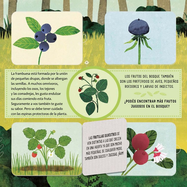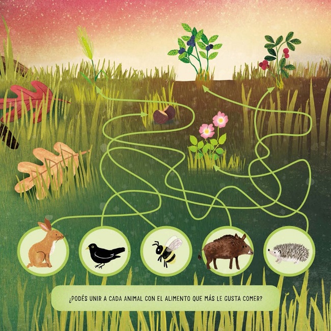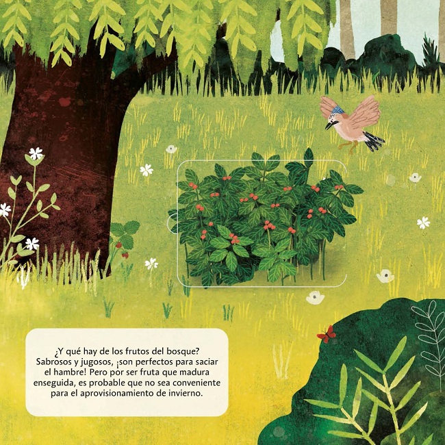 El arrendajo es un pájaro que podemos encontrar con frecuencia en cualquier paseo campestre. Se alimenta tanto de invertebrados como de frutas y semillas. En el segundo caso, tiene por costumbre enterrar una parte de aquello que recolecta con la sabia intención de afrontar los tiempos fríos y de escasez con todas las garantías. Mientras emite su ruidoso canto, el pequeño animal identifica los vegetales que encuentra, a la vez que ayuda al lector a discernir (haciéndolo partícipe del juego); entre los frutos comestibles y los peligrosos, a conocer cómo es la alimentación de otros vecinos del bosque, o las características principales de los árboles que conforman la floresta. Un libro-juego interactivo que ofrece tanto desafíos lúdicos como numerosas solapas con variada información y curiosidades sobre árboles, arbustos, hierbas y la dieta de los habitantes del bosque. Las ilustraciones, a sangre, son obra de Carmen Saldaña, una artista que siempre ha tenido predilección por retratar las pequeñas y grandes maravillas que esconde la naturaleza y dotar de habilidades humanas a sus protagonistas animales.