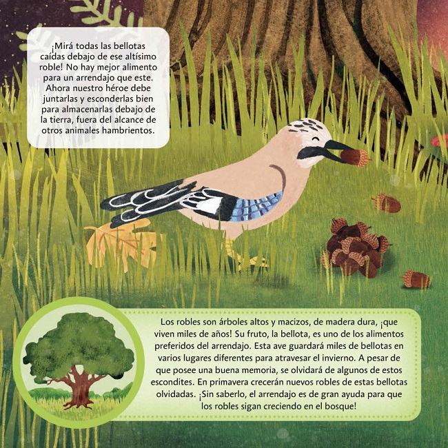 ¡Mirá todas las bellotas caídas debajo de ese altísimo roble! No hay mejor alimento para un arrendajo que este. Ahora nuestro héroe debe juntarlas y esconderlas bien para almacenarlas debajo de la tierra, fuera del alcance de otros animales hambrientos.
