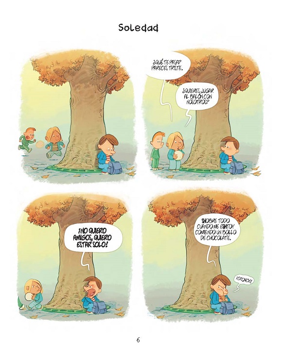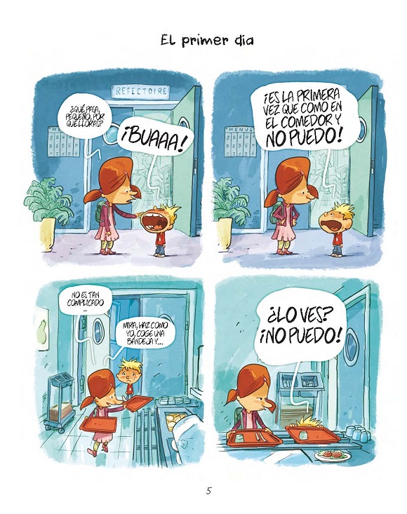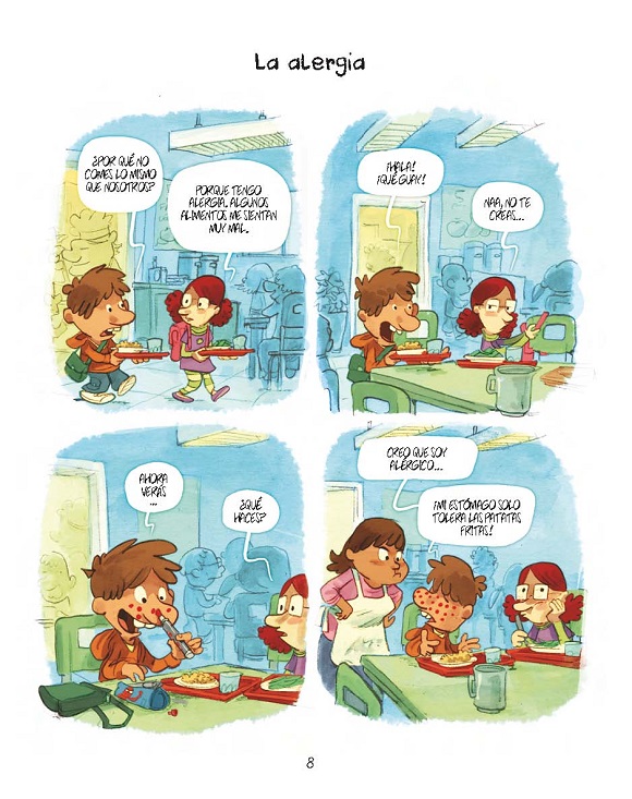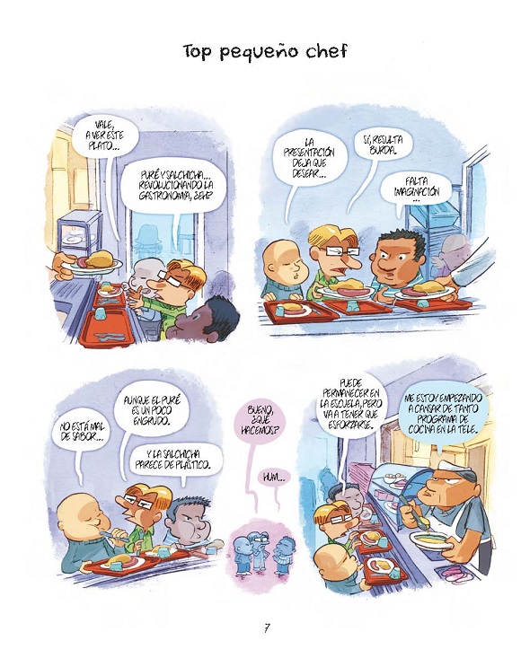 El primer turno del comedor escolar está poblado de amiguetes traviesos, niños temerosos, pequeñas encantadoras, cocineros peculiares y, sobre todo, mucho humor. Una colección de tiras cómicas, secuenciadas en vertical, ambientadas en la cantina de un colegio en donde se producen todo tipo de situaciones. Nob observa con atención los comportamientos de los niños y traza una divertida parodia que abarca muchos ámbitos, desde la influencia que ejercen en su percepción de las comidas los reality shows culinarios tan populares gracias a la televisión, hasta la relación amor-odio que establecen con alimentos como el brócoli. Las aventuras no solo se encuadran en ese espacio físico, sino que algunos de sus protagonistas nos hacen sonreír desde otros escenarios como un campamento de verano, la playa, la piscina o el hogar, a través de las distintas estaciones del año. El cómic también es un sugerente catálogo de relaciones personales que, sin duda, permiten desmitificar y conocer un poco más de cerca el mundo infantil actual. Una nueva oportunidad para disfrutar del seductor estilo gráfico del autor de las aclamadas series Marieta o Dad. La serie, publicada en su día por Dibbuks con el nombre de “El comedor”; ingresa en el rico catálogo de Kómikids como una de las novedades de la temporada.