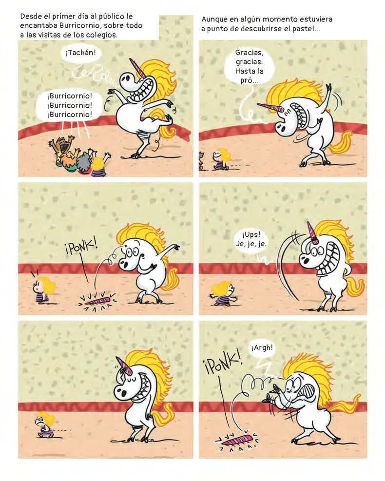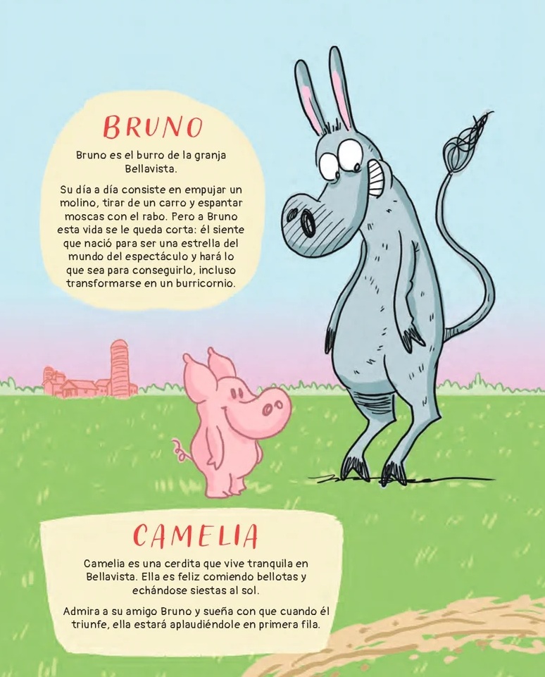 Cada mañana, cuando amanece en la granja Bellavista, los animales están encantados de sus rutinas, excepto Bruno, un burro que sueña, a imitación de su ídolo, el pollino de Shrek; con dejar un día el gris anonimato del campo y convertirse en una estrella. El paso del convoy del Teatro de las Maravillas le trae una oportunidad que podría aprovechar, pero, ¿qué puede hacer para impresionar al público? ¿Posee alguna cualidad excepcional? Lo tiene claro: ¡se hará pasar por un unicornio! Esta acción conlleva sus riesgos, no es fácil transformarse en alguien que uno está lejos de ser y máxime cuando una inteligente joven puede deshacer la mentira cuando empieza a alcanzar fama en su improvisada carrera. El autor despliega todas sus artes gráficas, destacadas en Canal Lector desde sus primeras publicaciones (allá por 2017); por su alegre personalidad y un caricaturesco, a la par que entrañable, elenco de personajes principales (animales humanizados como Camelia, la amiga cerdita del protagonista; Gracia, la vaca, o Manuela, la gallina; así como la despistada Julieta, granjera titular, o la inteligentísima Frida, una de las alumnas más aventajadas del colegio que visita el teatro). La puesta en escena, en la que encontramos analogías con series extraordinarias de animación como "La oveja Shaun" (Aardman Animations y HIT Entertainment); cautivará a los lectores que están empezando a dar sus primeros pasos autónomos en el hábito lector y en el disfrute de cómics.