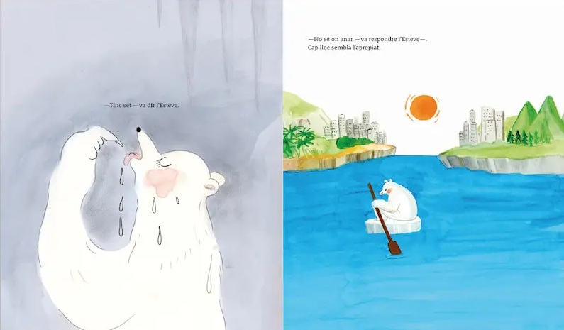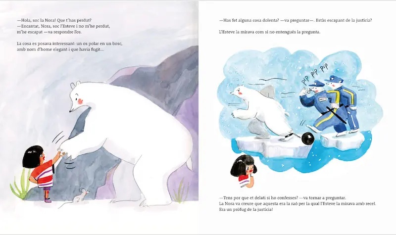 ¿Qué pensarías si, en un paseo por el bosque, te encontraras con un oso polar? Tal y como van algunas cosas, nada es imposible. Escondido en una gruta, el asustado animal confiesa a Nora que está perdido, y que no ha llegado allí como consecuencia de un deseo propio, una travesura o una persecución, sino motivado por la progresiva destrucción del ecosistema en el que siempre ha vivido. Preocupada por las palabras del plantígrado, la pequeña indaga en el ámbito familiar, a pesar de la incredulidad de los padres; y encuentra junto a su tío una solución transitoria. ¿Ayudará al animal a descubrir algunas aptitudes poco explotadas? ¿Abrirá nuevas expectativas vitales? ¿Generará inéditas líneas de negocio al clan que lo ha acogido? Una divertida aventura, diseñada con ilustraciones expresivas y humorísticas con acuarelas, que esboza un aviso a navegantes, una llamada a la acción contra el cambio climático que puede terminar con estas emblemáticas especies. El álbum destila personalidad y combina el plano aventurero con la reivindicación social, e incita a los pequeños lectores a reflexionar mientras dibuja sonrisas.