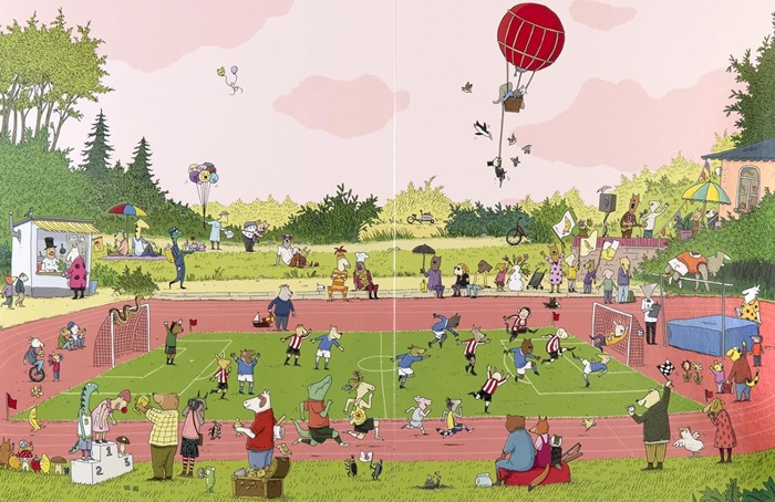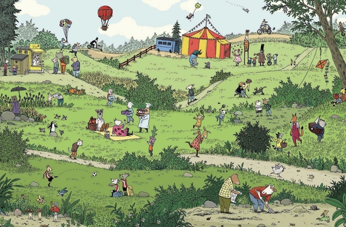 Un instante de la vida en el pueblo, fragmentos de una lúdica jornada campestre -con el circo instalado en las proximidades, en segundo plano, y preparado para cautivar a los más pequeños que quieran acercarse-; pasajes en la falda de la montaña, escenas de relajación en torno al lago, un paseo por el bosque, justo en el momento que ha empezado a llover, o un peculiar partido de fútbol (todos los protagonistas son animales humanizados); componen el catálogo de situaciones que el ilustrador alemán Seguir leyendo