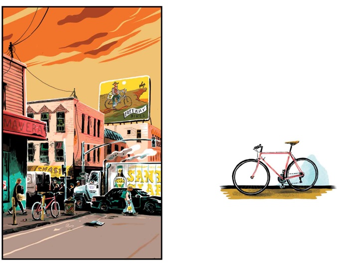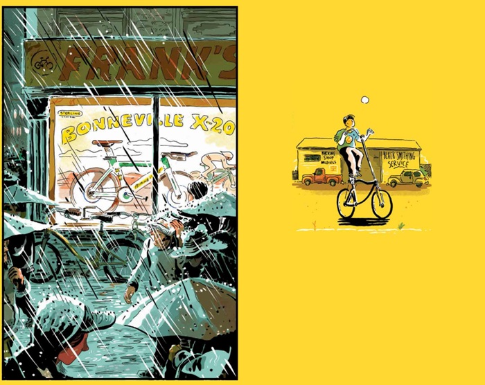 La bicicleta, junto con el vinilo o el dado, objetos que nunca dejan de ser actuales, merecía un libro íntegramente dedicado a reflexionar sobre su origen, evolución, tipologías y todo tipo de ideas relacionadas al noble arte del pedaleo. A través de treinta y un capítulos, profusamente ilustrados, alternando la secuenciación de cómic con las infografías o el dibujo a página completa, la pareja de creativos checos, por supuesto ciclistas en "cuerpo y alma" a tiempo completo -como se describe en la biografía-; comparten curiosidades, minuciosos detalles de su anatomía mecánica, apuntes históricos, pequeños homenajes (por ejemplo a los distintos inventores que fueron mejorando la idea inicial); ejemplos de la cultura cívica que implica su uso en la gran ciudad, éxitos deportivos y secciones sobre indumentarias apropiadas... Incluso un apartado dedicado a ese peligro que llevan implícito, las temibles caídas, distinguiendo los diferentes tipos de superficies o elementos que pueden propiciar el accidente. Ameno, muy original e inspirador, genera interés y despierta el espiritu aventurero a los lectores que ya la usaban y, estamos seguros, que unas tremendas ganas de empezar o retomar el hábito a los reacios que, seguramente, de niños fueron grandes corredores.