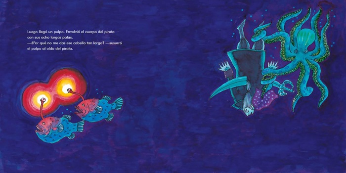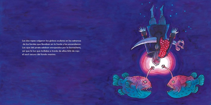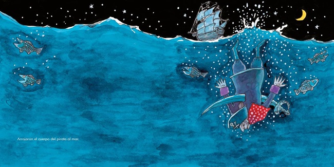 El artista japonés Masakatsu Shimoda aborda, mediante una narración metafórica estructurada en escenas descendentes (comienza sobre la cubierta de un barco y termina en el fondo del mar); los últimos minutos de vida de un peligroso pirata que, derrotado en un combate cuerpo a cuerpo, va desintegrándose metro a metro en su contacto con los animales humanizados que pueblan el océano (tanto la anatomía como los objetos de valor que portaba). Con cada elemento, el personaje parece liberarse de las cosas superfluas, incentivando al lector a pensar en las cosas que, realmente, merecen la pena o tienen importancia para cada uno. Hasta en las sombras de los más aguerridos corsarios hay un hálito de fragilidad, que el ilustrador captura muy bien en un doble plano. Las imágenes, dispuestas a sangre, impactan por el tratamiento de color (una paleta de tonalidades que ambientan a la perfección ese descenso a la zona abisal). Original y provocador, el álbum obtuvo una mención especial en la edición 2024 de los prestigiosos BolognaRagazzi Awards.