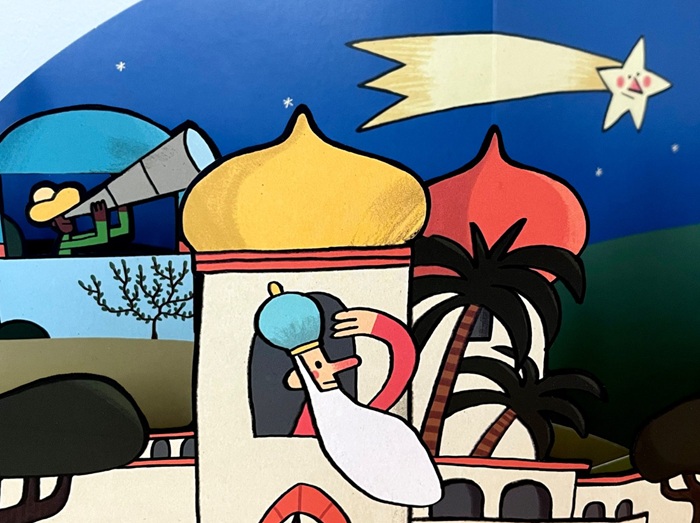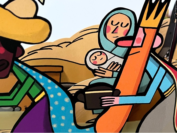 Al ritmo de las rimas consonantes, mientras brotan los troqueles -efectiva y brillante ingeniería en papel-; en cada doble página, acompañamos a los Reyes de Oriente en su camino tras el cometa reluciente. Tal y como relata la vieja historia, que ha acunado a tantas generaciones, oro, incienso y mirra llevan en sus zurrones, obsequios para un Niño, de mirada dulce y un halo especial, nacido en un portal entre el buey y la mula (que aquí también toman partido en la narración). A esos mismos monarcas, los niños de todas las generaciones siguen escribiendo cartas, llenas de ilusión y buenas voluntades, a la espera de que algo llegue a cada hogar. Mientras tanto, bajo las luces del árbol, al calor de la familia, entre celebraciones y cabalgatas, el relato invita a conservar la ilusión en una lectura compartida, de tintes teatrales, que garantiza la atención por el cálido y colorista trabajo de Inaraja, fiel a sus premisas gráficas habituales, y al espectáculo tridimensional que genera el paso de las páginas, una experiencia analógica que estimula la imaginación y mantiene la esencia del relato bíblico en los primeros lances.