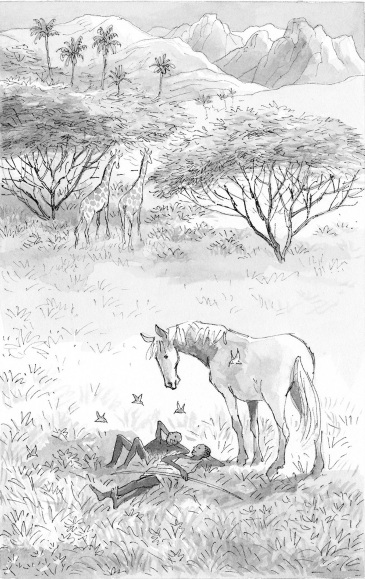 Y algunos leones son reyes Es una cebra sin rayas, de pie entre las hierbas amarillas, con dos niños tumbados a su sombra. - Fíjate qué grande es. La chica se llama Alma. Se dirige a su hermano pequeño, que está tendido a su lado. - ¡Fíjate! Están bocarriba, pegados el uno al otro en esa pradera infinita.