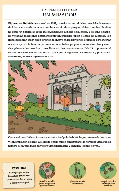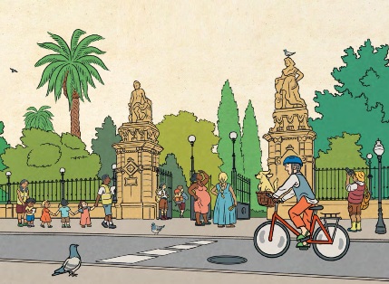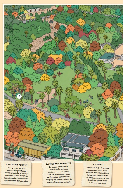 Los parques urbanos parecen que han existido siempre como contrapunto natural a la grisura y contaminación asociadas a las grandes urbes, sin embargo, la mayor parte de los existentes fueron creados no hace tanto, en el siglo XIX, al hilo de la Revolución Industrial que sacudió a muchos países. Hoy sabemos, con certeza, que son imprescindibles pues reducen la temperatura y el ruido del entorno, purifican el aire (son los "pulmones" de las poblaciones); y, por supuesto, aumentan la biodiversidad del lugar (en esta obra divulgativa puedes descubrir una larga lista de animales que viven entre los árboles de estos espacios naturales); e influyen incluso en el ánimo de los habitantes (¿quién no se alegra al escuchar el canto de un mirlo o al respirar el aroma de una higuera?) Las autoras se centran en catorce de los más emblemáticos, un listado muy reducido teniendo en cuenta la cantidad de florestas imprescindibles que, solo en España, podemos disfrutar (el bello Parque Genovés, a orillas del Atlántico, en Cádiz; el literario Campo Grande en Valladolid, fuente de inspiración permanente para escritores como Miguel Delibes; el Campo de San Francisco en Oviedo, con 90.000 metros cuadrados y con orígenes en el siglo XIII, por poner algunos pequeños ejemplos). Los mapas muestran las curiosidades de cada lugar (hay representación de todos los continentes); e invitan al juego con una propuesta lúdica que pone a prueba la pericia visual de los lectores. Además, cada representación incluye grandes "tomas" cenitales para representar los principales monumentos, plantas y animales que viven en ellos; un gran número de curiosidades, y la reivindicación de todas aquellas personas y asociaciones que garantizan la salud de esos sanadores territorios medioambientales, garantes de la salud y la "luz" en nuestras ciudades. Las ilustraciones, pobladas de detalles, están firmadas por la artista barcelonesa Helena Bonastre, que define sus diseños con técnicas digitales a la hora de reafirmar los trazos y aportar color.