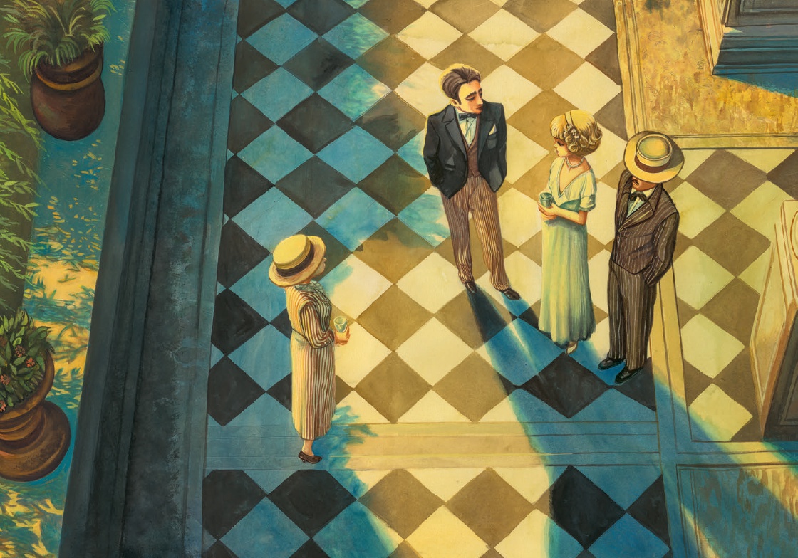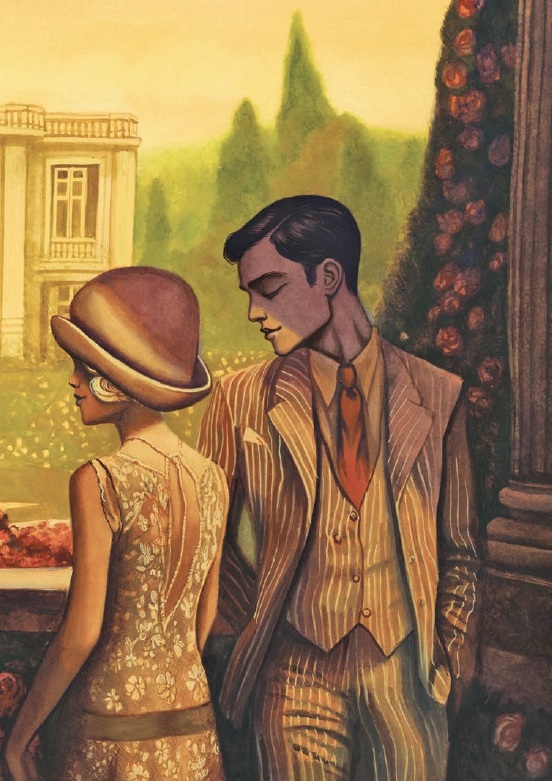Benjamin Lacombe (París, 1982); no necesita presentación. En los últimos años ha confirmado que es uno de los ilustradores más talentosos e influyentes de su generación. Avalado por grandes éxitos, ha insuflado nueva vida a clásicos de la literatura universal al mismo tiempo que presentaba inolvidables relatos en el que se hacía cargo de texto e imagen. En esta versión del célebre título de Francis Scott Fitzgerald, adapta su estilo característico, teñido de melancolía, al ecosistema sofisticado y decadente que destila la novela publicada hace un siglo (1925). El resultado es una interpretación con empaque, oscura y nostálgica que, sin duda, cautivará a los lectores más exigentes. Con ritmo crepuscular conocemos las andanzas y pasiones del enigmático millonario Jay Gatsby, obsesionado con la bella Daisy Buchanan. Esa relación es el vehículo perfecto para describir la realidad social de los Estados Unidos en aquella "feliz" década, caracterizada por una prosperidad económica sin precedentes, la consolidación de un género musical fascinante -hay ecos del mejor jazz entre las imágenes-; pero también momento de especial florecimiento de actividades delictivas como el contrabando. Fitzgerald pone sobre la mesa la fragilidad del "sueño americano", apunta con su foco certero a los excesos que abrieron la puerta a la decadencia, con el regalo añadido -cada pocas páginas- de una sensacional lámina (simple o doble) para detenernos y disfrutar. Cada episodio incluye elementos decorativos y un hilo separador que convierten el formato en exquisito placer para los sentidos. El propio artista firma un interesante posfacio en el que desgrana su motivación para aceptar este reto, al mismo tiempo que comparte una amplia bibliografía consultada o breves apuntes biográficos del escritor norteamericano al que se homenajea. En lo que se refiere a la técnica, combina dibujo tradicional con técnicas digitales, generando contrastes de luz y color o escenas casi teatrales "marca de la casa".