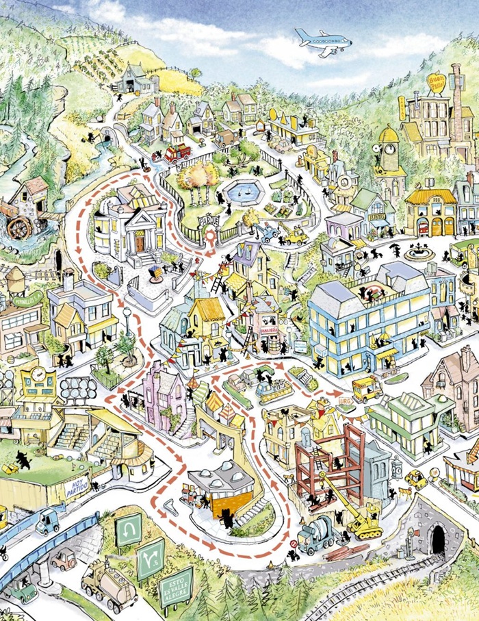 Los servicios públicos disponibles para los ciudadanos de Valle Alegre gozan de excelente vitalidad y cuentan, por lo que vemos, con plantillas carismáticas y comprometidas de profesionales. Hace poco conocíamos los entresijos de su Parque de Bomberos, hoy nos abren las puertas del hospital, un espacio que desarrolla el crucial trabajo de cuidar la salud de todos los componentes del clan, variopintos animales humanizados. Además, en estos días se celebra el Gran Desfile en el centro de la urbe, lo que está generando inquietud e incluso hechos insólitos, como que algunos personajes guarden sitios en los toldos de los comercios para asegurar una buena visión desde días antes. Aunque los contenidos referentes a las especializades del centro médico o las escenas en las habitaciones y quirófanos puedan parecer fruto exclusivo de la imaginación de la autora, lo cierto es que ha contado con una revisión profesional por parte de la técnica en imagen para el diagnóstico del Hospital Universitario de Girona, Kirste Jane Mowatt. Además de mostrar la dinámica de trabajo, presentan el ramillete de profesiones adscritas a cada planta, metodologías de atención al enfermo y otras situaciones, complementarias, desde una óptica humorística a la par que informativa. Al mismo tiempo, Alley introduce un juego de agudeza visual consistente en localizar a una serie de personajes en las láminas ilustradas. La secuenciación bebe del lenguaje del cómic (bocadillos, alternancia de viñetas enmarcadas y sin recuadrar...); y de los libros interactivos de búsqueda, tan populares en los años ochenta y noventa del siglo XX. La construcción de las panorámicas a doble página -desde las guardas-; integra tantas acciones e interacciones entre los protagonistas que están garantizadas horas de buen humor escudriñando cada detalle. Además, la presentación de las labores de los especialistas puede despertar la vocación temprana de los pequeños lectores y ofrecer respuestas a la típica (y tópica) pregunta con la que se les aborda frecuentemente: "Y tú, ¿qué quieres ser de mayor". Sugerente y divertido.