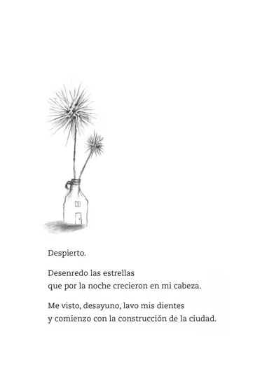 Despierto. Desenredo las estrellas que por la noche crecieron en mi cabeza. Me visto, desayuno, lavo mis dientes y comienzo con la construcción de la ciudad.