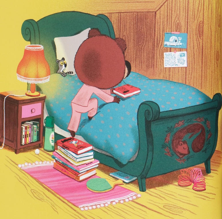 Osito disfruta en la habitación de su última adquisición literaria, seguro que se trata de un relato adictivo y de calidad (como intuimos viendo la pila de lecturas pasadas, entre las que se encuentran "Ariol", un autohomenaje del ilustrador, el genial Marc Boutavant -a lo largo del relato también nos parece identificar a un primo cercano de "Seguir leyendo