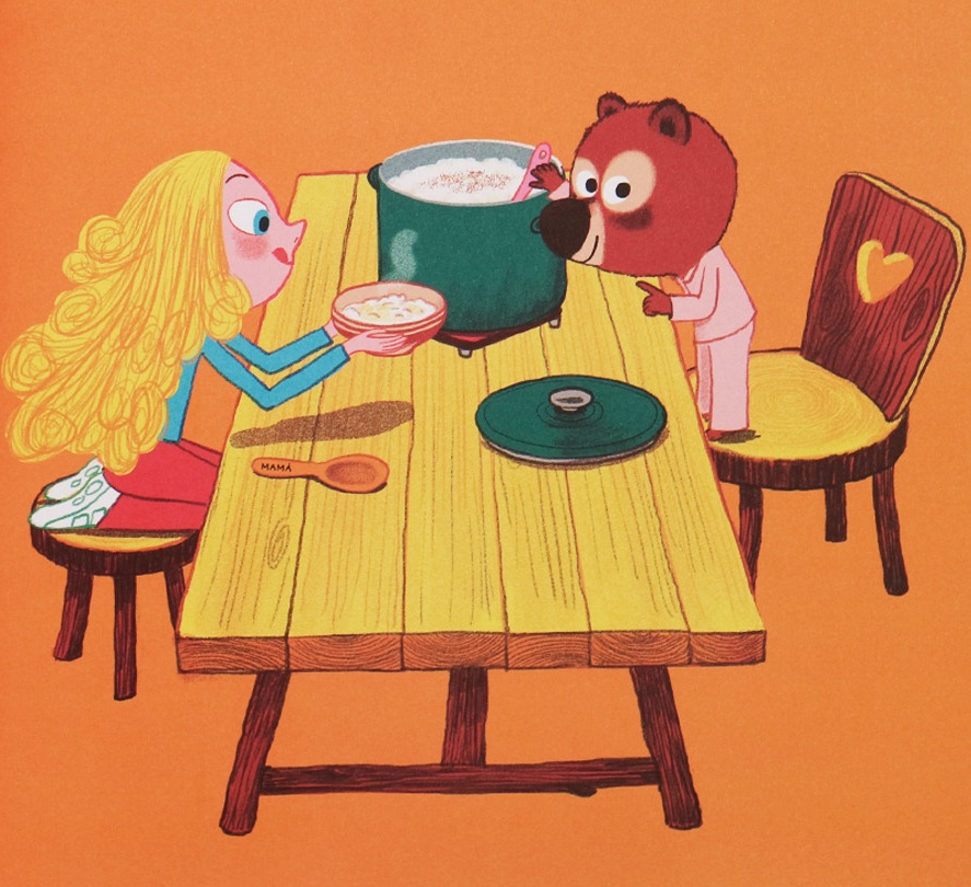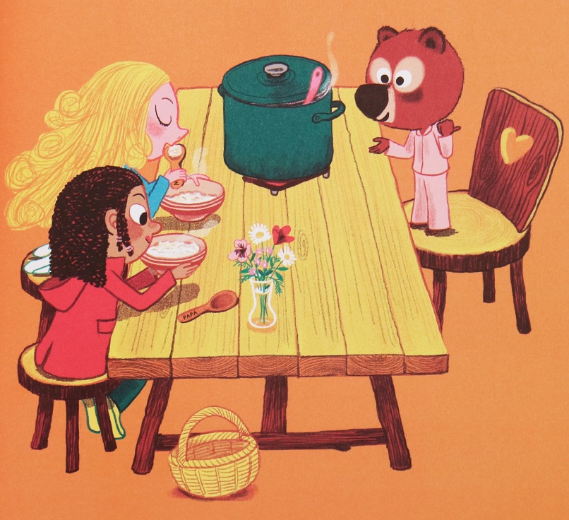 Osito disfruta en la habitación de su última adquisición literaria, seguro que se trata de un relato adictivo y de calidad (como intuimos viendo la pila de lecturas pasadas, entre las que se encuentran "Ariol", un autohomenaje del ilustrador, el genial Marc Boutavant -a lo largo del relato también nos parece identificar a un primo cercano de "Perro apestoso"-). Pero mantener la tranquilidad en un momento tan placentero se antoja difícil cuando, cada pocos minutos, la puerta de la casa no deja de ser aporreada por distintos y conocidos personajes que buscan refugio y, sobre todo, un plato de la afamada papilla del anfitrión. Por allí desfilan Ricitos de Oro, Caperucita Roja, los Tres Cerditos (los únicos que mantienen su apariencia original); también la abuelita... ¡Un momento! ¿Seguro que es la abuelita? ¿No tiene los brazos demasiado peludos? Solo la picaresca del protagonista permitirá un final feliz y, por supuesto, alcanzar definitivamente el placer perseguido: meterse bajo las mantas y continuar saboreando su libro... Al hilo del divertido retelling de la poeta británica, Boutavant despliega su catálogo de divertidas ilustraciones, resultado de la fusión de protagonistas perfilados en trazos sencillos y expresivos, con una paleta cálida de ocres, verdes, naranjas y rosados, bañada por luz natural, que aporta una sensación de acogedora intimidad. Cada doble página, desde las guardas -al amanecer, al atardecer-; esconde una amplia variedad de detalles que se aprecian mejor en una sesión compartida, desde cambios en la iluminación que marcan el paso del tiempo hasta escenas en segundo plano que enriquecen la atmósfera doméstica, a cada minuto más caótica y atestada de gente...