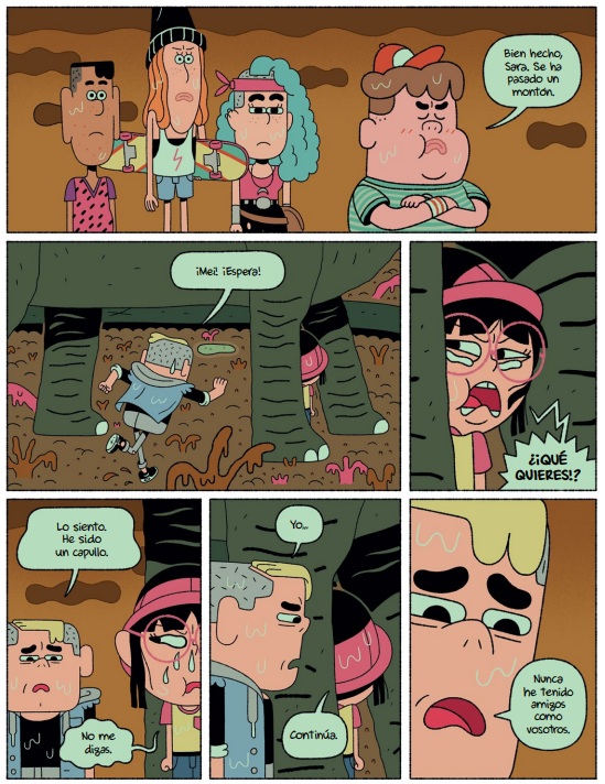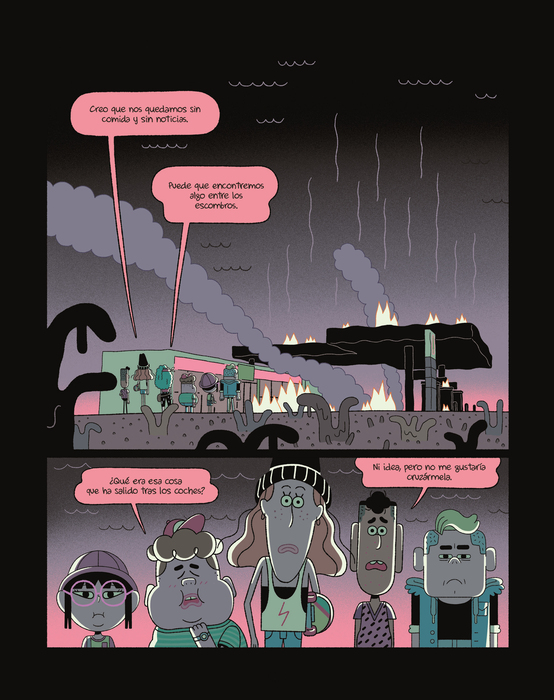 La trilogía de tintes distópicos llega a su fin con una nueva aventura de la pandilla, recién llegada de su viaje a través del tiempo a un futuro inquietante y poco esperanzador. Las consecuencias del cambio climático son demoledoras y para sobrevivir, algunos humanos han tomado la determinación de luchar contra la corporación energética que, con aviesas intenciones, actúa como dueña del mundo. La chispa que ha provocado el despertar es el corte de suministro (de agua e internet), que pone en peligro la existencia de, sobre todo, los más débiles. Inmersos en la rebelión contra el ejército de robots, los valores y vivencias acumuladas a lo largo de las anteriores andanzas serán muy útiles al grupo, que aquí suma una nueva integrante. Más allá de llegar o no a buen puerto lo importante también es conocer si Piero, Sara, Mei, Arnold, Driss y Arlette serán, además, capaces de volver a su presente real. Bajo los trazos caricaturescos, rasgos geometrizantes e interacciones con diálogos chispeantes, la historia hace referencia, de forma solapada, a otros problemas del mundo actual como el acoso escolar o la necesidad de concienciar sobre la importancia de proteger nuestro medio ambiente, consignas que tienen ya muy presentes -por fortuna-, las nuevas generaciones de lectores. Una serie muy interesante que transcurre por imaginativos y variopintos escenarios, como hemos visto en los capítulos anteriores, desde parajes yermos hasta territorios poblados de seres prehistóricos.