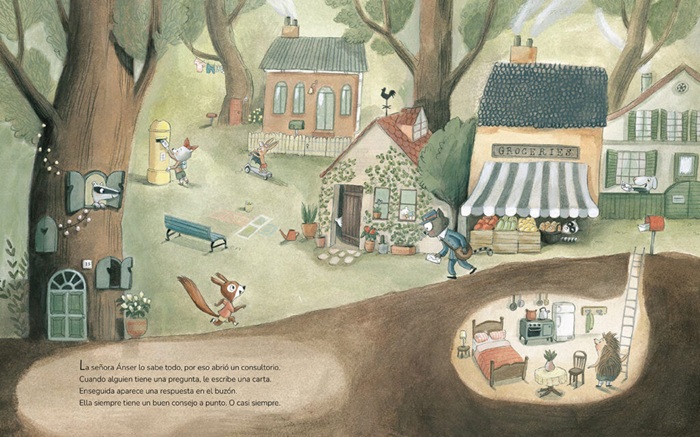 La señora Ánser lo sabe todo, por eso abrió un consultorio. Cuando alguien tiene una pregunta, le escribe una carta. Enseguida aparece una respuesta en el buzón.