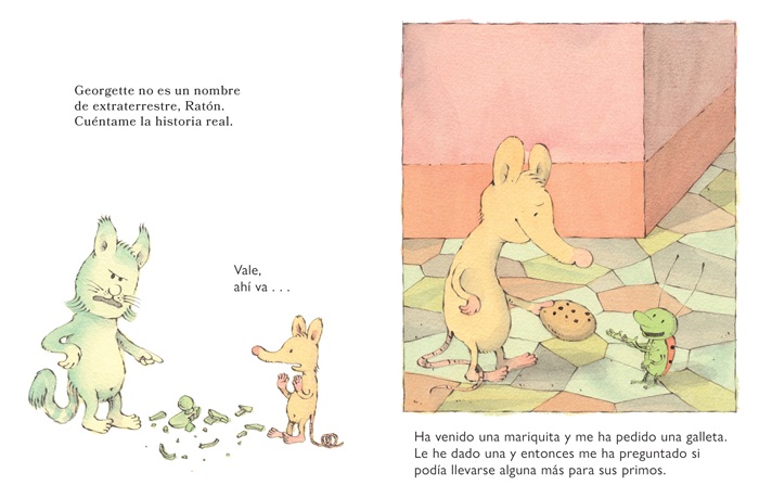 Gato y Ratón tienen, como todos, algunos pequeños problemas de convivencia. Ruzzier, que tiene un don para captar el ecosistema cotidiano de animales humanizados unidos por sólidas amistades (recordemos a Fox y Chick, o a los ratones y patos que han protagonizado otros relatos anteriores); describe la situación que se produce a partir del hallazgo, por parte del primero, de un gran bote de galletas que se ha caído al suelo. Todo apunta a que Ratón es el culpable, pero este justifica su inocencia con una imaginativa coartada en donde cobran protagonismo desde los propios dulces -que parecen tener vida propia-; hasta diferentes personajes fantásticos, como extraterrestres o monstruos, convertidos en responsables del desaguisado. La magia de la narración oral cautiva al felino, al que finalmente le da igual el responsable del accidente mientras siga disfrutando de cuentos tan divertidos. La amistad de los compañeros está a salvo, y la imaginación del pequeño transforma lo cotidiano y carente de importancia en momentos de pura fantasía, siempre con un toque de humor enriquecedor, como acostumbra a hacer en sus cómics y libros ilustrados el afamado autor e ilustrador milanés.