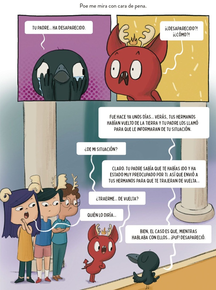 ¡Hola, cachorro de humano! ¡Nos volvemos a encontrar! Sí, sigo aquí, en tu mundo... Aún no me han crecido los cuernos, aunque en esta nueva aventura estoy decidido a que eso cambie. Lo noto en el aire, que está cargado de azufre. ¡Ah! Eso me recuerda que esta mañana me he inventado una adivinanza. ¿Te la digo? Es nivel demonio principiante: