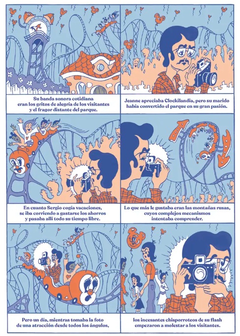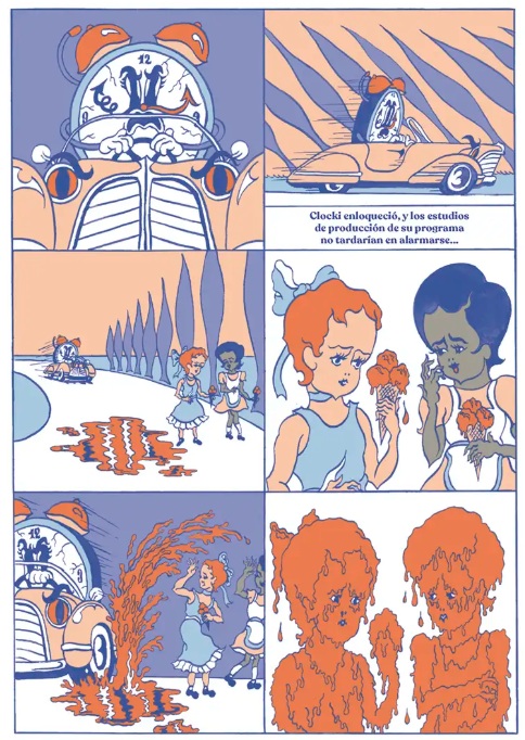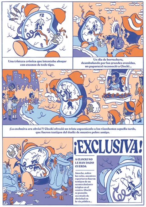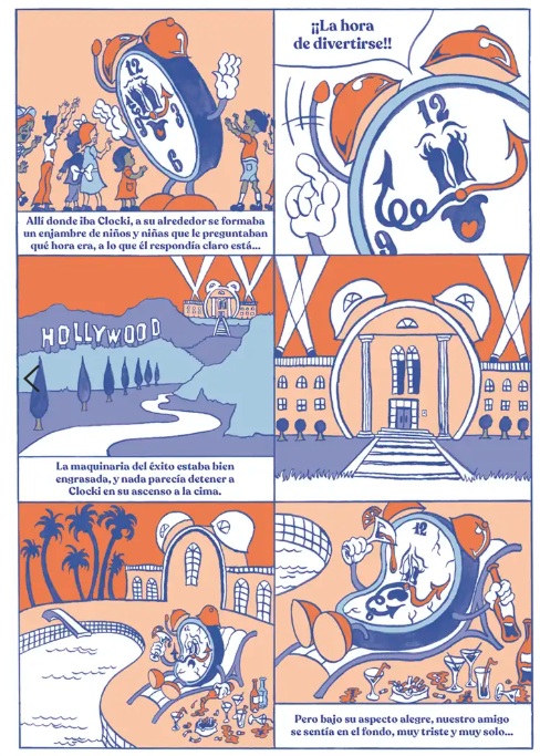 El universo onírico, saturado de personajes, objetos y acciones, en una reducida paleta de tonalidades, que emplea el joven diseñador francés Mathias Martinez para describir las surrealistas y macabras aventuras de Clocki, constituyen una de las señas de identidad de este creador, aficionado a generar una climas dicotómicos en los que reina, a partes iguales, lo angustioso con lo seductor. La identidad visual es reforzada en una edición muy elegante, en la que se han cuidado todos los detalles, desde la tipografía hasta la distribución de los cartuchos narrativos o la inclusión de una camisa desplegable que se transforma en un divertido póster. Destacada con una Mención Especial en la categoría "Comics Young Adult" de los premios que se otorgan en la Bologna Children's Book Fair, narra la rocambolesca historia de un antiguo héroe de cómic, emparentado visualmente con las creaciones de autores como Grim Natwick, Shamus Culhane y otros iconos del cartoon. Una falsa biografía que permite acercarse al ocaso y degeneración del que fue, un día, primer protagonista animado con sonido y color en la historia del cine. Aquel eco mediático fructificó en la inauguración de Clockiland, un parque de atracciones que sigue fascinando a las nuevas generaciones. Sin embargo, como otras aparentemente felices creaciones, en el origen del personaje y de su particular universo lúdico confluyen extrañas e inquietantes revelaciones. El puzle se construye a partir de las declaraciones y vivencias de diversos personajes que trabajaron o visitaron este centro de ocio. Magistral acercamiento a la estética visual que triunfó en los dibujos animados y cómics de la tercera década del siglo XX, con una distorsión de protagonistas y escenarios que confiere un halo grotesco y angustioso al relato (retratado con crudeza, por ejemplo, en el horror que sufre, al ritmo de rock and roll, la pequeña Susi). Trufado de crítica social solapada y sentimiento de amenaza constante, como bien señalan en la promoción editorial, las viñetas parecen acercarnos a un final desolador, "como si estuviera a punto de quemarse la película en el proyector". Original e irreverente.