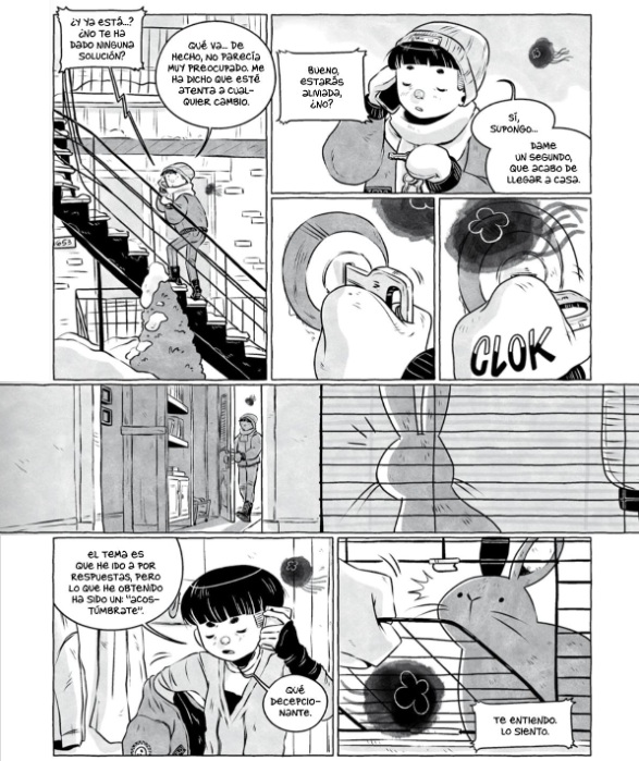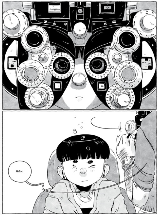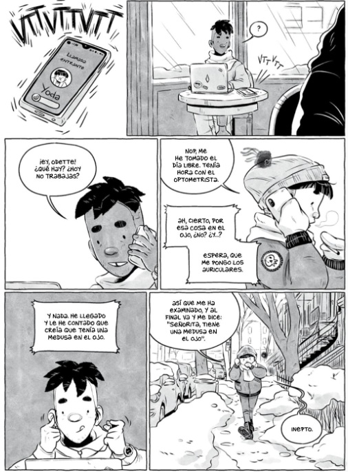 Samantha Leriche-Gionet, que firma sus cómics con el seudónimo BOUM, conmueve con una galardonada historia (tanto en su país, Canadá, como en la industria norteamericana, donde obtuvo un Eisner); de tintes autobiográficos. Odette acude al optometrista y recibe un extraño diagnóstico que, sin embargo, en cierto modo, esperaba. Tiene una medusa en el ojo. La vida continua sin variaciones tanto en la librería en la que trabaja como en la relación que mantiene, hasta la aparición, casi simultánea, de una chica por la que siente atracción y del progresivo agravamiento de su dolencia, simbolizada en una multiplicación de esas alteraciones visuales. Mientras trata de asumir un mal degenerativo, afronta los radicales cambios en su ecosistema personal con los miedos inherentes a la soledad. Un emocionante relato teñido de amistad, amor y tenacidad, secuenciado con elegancia a lo largo de las cuatro estaciones, a través de diseños narrativos originales que transmiten a los lectores las mismas sensaciones de inestabilidad y angustia que siente la protagonista. A lo largo de la novela gráfica, trazada en blanco y negro e influenciada por rasgos del manga, encontramos abundantes referencias a distintos iconos de la cultura popular (la música de Violent Femmes, Prince, Gorillaz, Janelle Monáe o Le Tigre; los cómics de Rumiko Takahashi, o los animes de Yukito Kishiro).