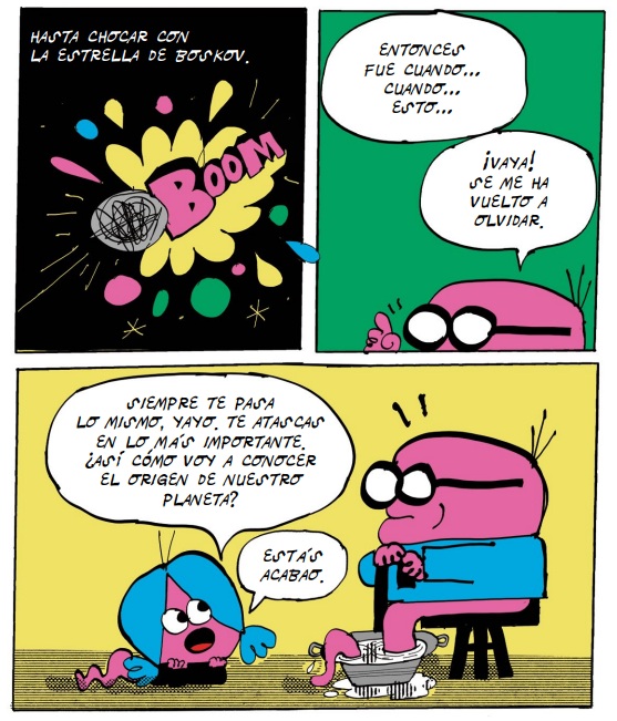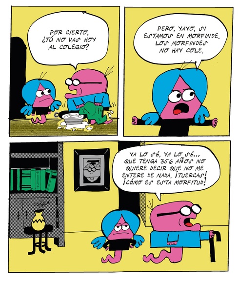 El espíritu divertido y transgresor del fanzine, ámbito en el que Lorenzo Montatore, tiempo atrás, dejó su sello, está presente en la primera aventura de Los Morfis. Un cómic divertido e irreverente, concebido para el público infantil, que utiliza el fotomontaje, el humor escatológico y una estética pop y luminosa -que recuerda a la ideada por Talus Taylor y Annette Tison, o a otros iconos de los sesenta y setenta del siglo XX como Pierre Culliford-; para dibujar una sonrisa en los lectores a base de nombres ocurrentes y sencillos gags. La aventura nos traslada al planeta nacido a partir de la colisión de la gran pelotilla (no preguntéis detalles sobre la pangea de la que parte su ecosistema), con la estrella de Boskov. Allí residen Oliveta y su "yayo", quienes descubren un huevo extraterrestre al que acompaña...un pato. Tras debatir sobre su origen y posible nomenclatura en compañía de los componentes del cabildo (momento que describe a la perfección el modus operandi de algunos políticos), llegan a la conclusión de que incluso podría ser una estratagema del malvado Pelusso, una culebra cascabelera con muy malas ideas. Mientras custodian el insólito asteroide, el calor provoca su rotura y la posibilidad de conocer a su huésped, personaje desagradable que, sin embargo, facilitará la construcción de un sistema defensivo (el muro de "Bertín") que puede garantizar, por mucho tiempo, la seguridad del pueblo sin nariz frente al mal. En la parte final se ofrecen fragmentos de la libreta de ideas del autor, en cuyas páginas creció la semilla del cómic, además de algunas composiciones extra que beben de la estética "Bruguera" -la plancha parece sacada de la revista DDT-; o un cartel anunciador de la gran fiesta que se celebra en las últimas páginas.