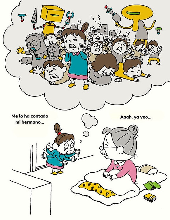 Los mayores dicen que, en el futuro, pasarán cosas horribles. Un amigo del cole lo ha escuchado allí, también lo certifica el hermano de la protagonista... Pero la, seguramente, más sabia de la familia augura lo contrario. No tiene por qué ser tan terrible, seguro que hay muchas cosas interesantes y divertidas. Y es que, en ocasiones, la gente cree saber muchos datos que, en realidad, desconoce. Apoyada en la teoría de la abuela, nuestra protagonista deja rienda suelta a la imaginación y diseña mil horizontes posibles, todos ellos sugerentes y muy divertidos, incluso válidos para desactivar abusones y fabricar alternativas a comidas que no nos encantan. El mismo algoritmo puede aplicarse tanto a la hora de diseñar un mundo más justo como a la hora de cenar. Un simple huevo puede transformarse en una experiencia culinaria o lúdica inimaginable, aunque casi siempre la sugerencia de mamá suele ser la más fiable. La sensibilidad e inteligencia del artista japonés Shinsuke Yoshitake, que ya cautivó a la audiencia con sus anteriores títulos, está presente en un relato barnizado de sentimientos y pensamientos filosófico-poéticos que parten de lo cotidiano.