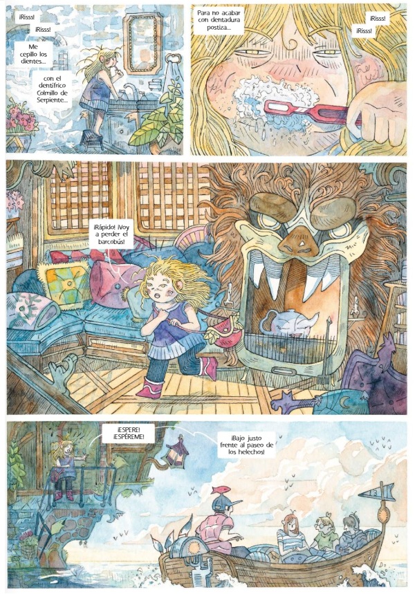 Desde las guardas, el artista francés Vincent Dock nos invita a adentrarnos en el sugerente mundo floral en el que transcurre la acción, con personajes y escenarios trazados a plumilla y colores al agua que confieren a cada página gran elegancia; y ecos, en algunos aspectos, de concepciones gráficas propias de Studio Ghibli y parentescos con la estética presente en las propuestas de otras autoras contemporáneas, como Nuria Tamarit o Gaëlle Geniller. La trama, de corte cozy, presenta las andanzas de dos huérfanas con capacidades mágicas (la hermana mayor, entre otras cosas, se desplaza en escoba voladora); que regentan la antigua floristería de sus padres. Aprovechando una jornada en la que solo Lily, la más pequeña, atiende al público, los hermanos Fimus y Fuligo, quienes se presentan como periodistas de la prestigiosa revista Cosmoficus Magazine, embaucan a la protagonista remarcando la reputación que tiene la tienda en todo el archipiélago. La otra bruja, Aurora, llega a tiempo para despedir a los desconocidos sin sospechar sus aviesas intenciones reales. Tras visitar al gran botánico, Sebastián, un huraño ser encerrado en una isla por voluntad propia, y comprender algunos secretos propios de su linaje, emprenden camino a las peligrosas islas de escarcha a la búsqueda de una planta ultrarrara. Al mismo tiempo, los oscuros navegantes que visitaron a las hermanas, trazan un plan de contraataque para prender fuego al negocio y hacerse con el árbol prístino que puede hacerles ganar una fortuna y garantizar la buena salud de su navío. Plantasía es el escenario, pues, de un enfrentamiento que traerá la desgracia a las jóvenes o afianzará la tienda como un proyecto con futuro, no solo una herencia de los que ya no están. Un derroche de originalidad con planteamientos estéticos muy seductores, editado con elegancia y orientado al segmento de edad preadolescente con mayor bagaje lector.