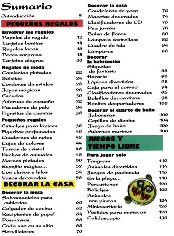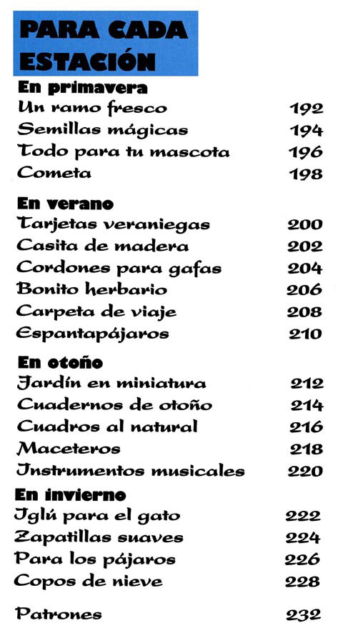 Actividad, bricolaje, creación, tres palabras que reflejan a la perfección la esencia de este completo manual. Se describe detalladamente cómo se realizan las propuestas creativas. Incluye esquemas y fotografías del proceso de elaboración, así como una ficha con los materiales necesarios. En todas las actividades se indica el grado de dificultad, el coste y la duración aproximada. La obra contiene un sumario, un índice alfabético y los patrones para facilitar la construcción de algunos de los trabajos propuestos.