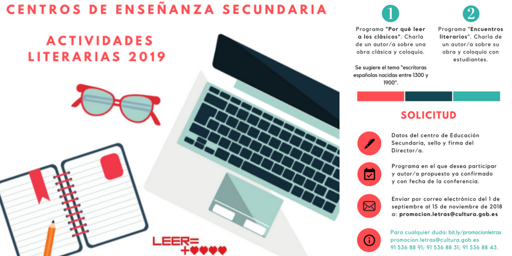 La Subdirección General del Libro, la Lectura y las Letras Españolas organiza, dentro del Plan de Fomento de la Lectura Leer te da vidas extra, dos programas de actividades para centros escolares públicos que impartan ESO.